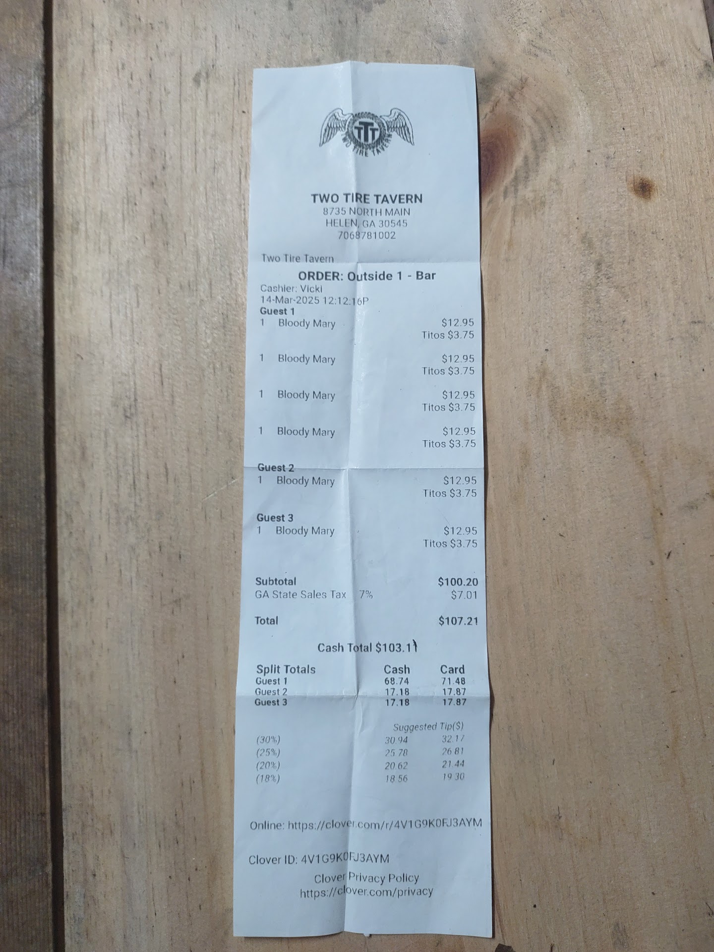 My family and I ate at TTT on a recent trip to Helen. We had a party of five adults and three children (one an infant). From the moment we were seated, we were practically ignored. There were several empty tables, and we observed the wait staff spending much more time at other tables, so I don’t think the issue was due to being understaffed. However, I was willing to give the benefit of the doubt. After 20 minutes of being seated, our order was finally taken. After another 25 minutes, our food arrived (not bad). Every drink at the table was empty, so we asked for refills. 80% through finishing our food, we finally got a refill (the only refill we received, by the way).