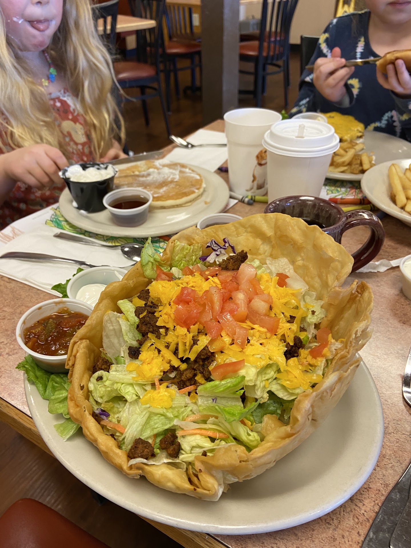 Wife got French Toast meal. Said it was French toast. Nothing flashy but she loved the huge sausage links. Kids got eggs and on got pancakes. The one that got hash browns kept talking about how they tasted funny. To describe them imagine someone puts tons of margarine on your potatoes and that's all you taste.