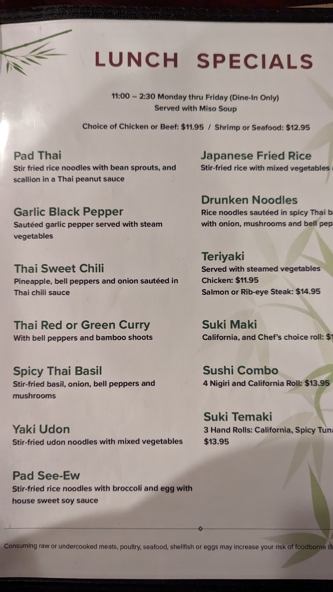 Read moreSadly, after 10+ years, I will not eat at Suki Cafe again after my recent terrible experience. I ordered the all-you-can-eat sushi dinner and placed my first order. But when I went to place my second order, the server told me the sushi bar was closed. The server had not given me any warning or done a "last call" for sushi. When I pointed out that I had ordered "all you can eat," the server told me, in essence, that I was out of luck, they now closed at 8:30, and the staff wanted to be out of there by 9:00. Another server aggressively told my partner and me that "most customers" look to Google for a restaurant's hours and the new 8:30 closing time is posted there (even though the Suki Cafe website itself, which is where I had looked, still says 9:00). They reluctantly agreed to re-open the sushi bar to make me four additional pieces of nigiri, but they made it clear they were doing me a favor (rather than simply doing the right thing). The manager, to her credit, came over and apologized for her employees' horrible customer service. But the entire incident left a bad taste in my mouth. As for our meals, the chicken teriyaki was mediocre and cold. I thought the salmon nigiri and the Dynamite roll were pretty good, and the rest of the sushi was so-so. I was told this evening that the restaurant had recently been purchased by a new owner, but that things would stay the same. In my opinion, however, the attitudes of some of the staff and the way they treat their customers have gone...