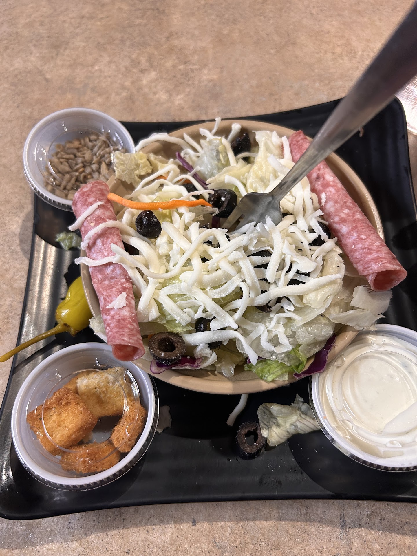 Read moreLooked up pizza places near me and this place came up first, perhaps due to its close vicinity to my hotel. I walked in not sure what to expect as the description said there is also video gambling machine ( Montana staple) To order, walk up to the counter and you will find a two sided laminated menu off to the right side. After looking the menu over I chose the dinner salad which was(iceberg lettuce, slivers of red cabbage, topped with shredded mozzarella, and black olives. (Oh and the rolled up salami) I was asked what kind of dressing I’d like and I chose ranch. The salad was brought to my table about 5 minutes after I sat down. The salad dressing, sunflower seeds and croutons came singly in small containers. I have no complaints about the salad. The small pizza came next-I ordered the Village Inn Pizza special- small and I enjoyed each bite. I would recommend this establishment, the customer service could be improved a bit. I had water with my meal and was brought a plastic cup and then I had to figure out where to fill it up. I spent...