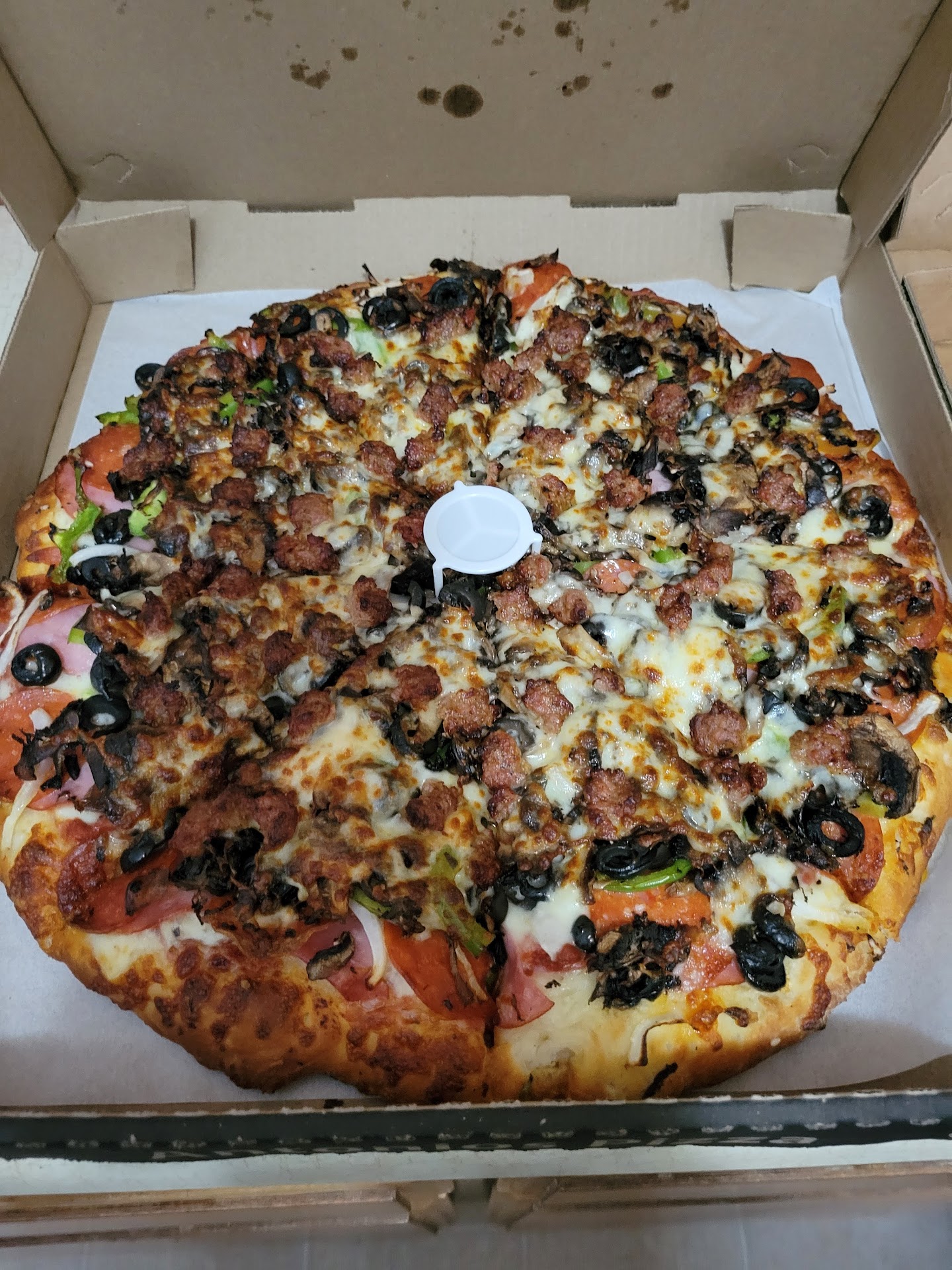 Okay in a pinch, the place itself, well don't look up at the ceiling because it shows that building is poorly maintained. I've been ordering from these people for over 20 years and now it takes an hour and a half to get a pizza. I should be at the top of the list given how long I have been a customer.