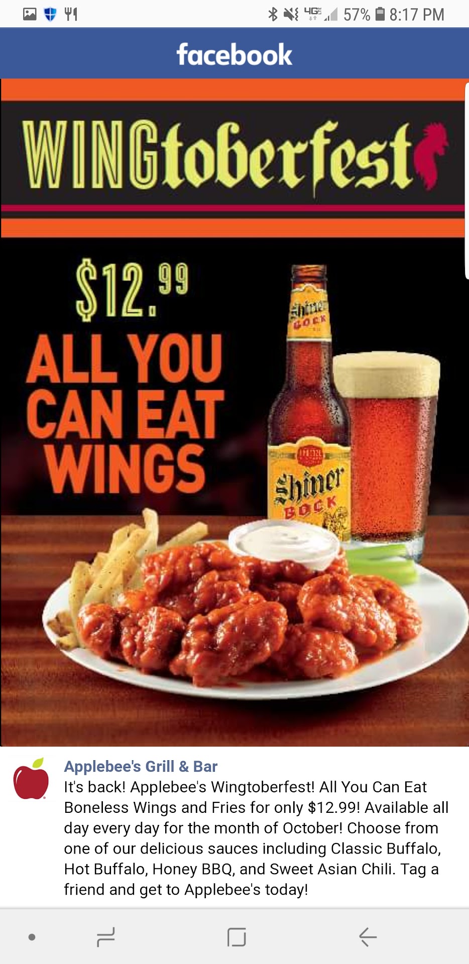 Read moreThis was a really fun place to come and visit! My friend and I ate from the 2 for $34.00 menu, I believe. We had a choice of several appetizers or salads. We decided on the Asian Bbq chicken wings (don't recall the exact name) but they were sweet, tangy and a little hot. They were boneless and delicious, perfect blend of sweet tang and some heat! Loved them! I then had a medium well steak and mashed potato that had the works...cheese, bacon bits, sour cream and garlic green beans. My steak wasn't what I was expecting...dry, lots of grissel, and very tough. Very disapppinting when I had heard such good things about their steaks. My mistake was waiting too long to say something. I was thrown off though because the first bite was flavorful. I also got strawberry lemonade that was delicious and refreshing on a very hot summer night. My friend got grilled chicken breast with mushrooms and shrimp. I'm not a seafood fan, but the chicken was tender, flavorful, and grilled to perfection. He let me have s few bites, we swapped and he agreed the steak was poor. Everything else was really delicious, and our server was wonderful. She was efficient, always had a smile on her face, and endured my friend's sometimes weak attempts to humor her with a gracious smile and laughter! Although, they didn't compensate us for the steak, they did comp us the strawberry lemonade and I got a glass to go. All things considered, the prices were very good and we were offered a good variety of food to choose from. The portion sizes were pretty generous also. I would definitely go back and revisit. I think this time I might get the chicken breast with mushrooms possibly! I hadn't been to this Hemet Applebees for many years, and it was nice to see them still serving up good food at reasonable prices and so many happy...