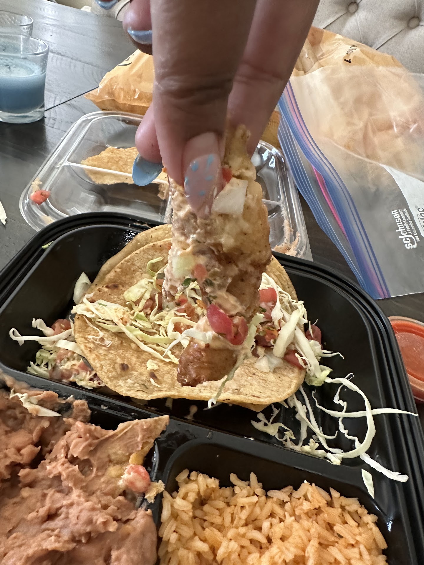 Also I checked my food, #11 two fish tacos and rice and beans. DO NOT EVER ORDER THAT …. the taco shells were stale partially wet, lettuce inside not even fresh and best part hardly was any fish in the taco to call it a fish taco,,, it was mostly the batter of the fish that was in the taco fried. Overpriced and feel cheated that I paid for this. I was so so displeased I lost my appt and didn’t care about going back to get...