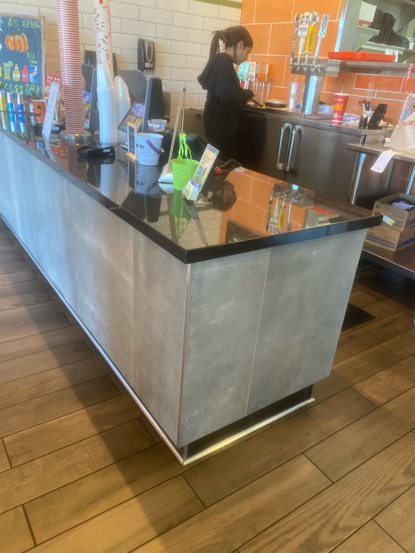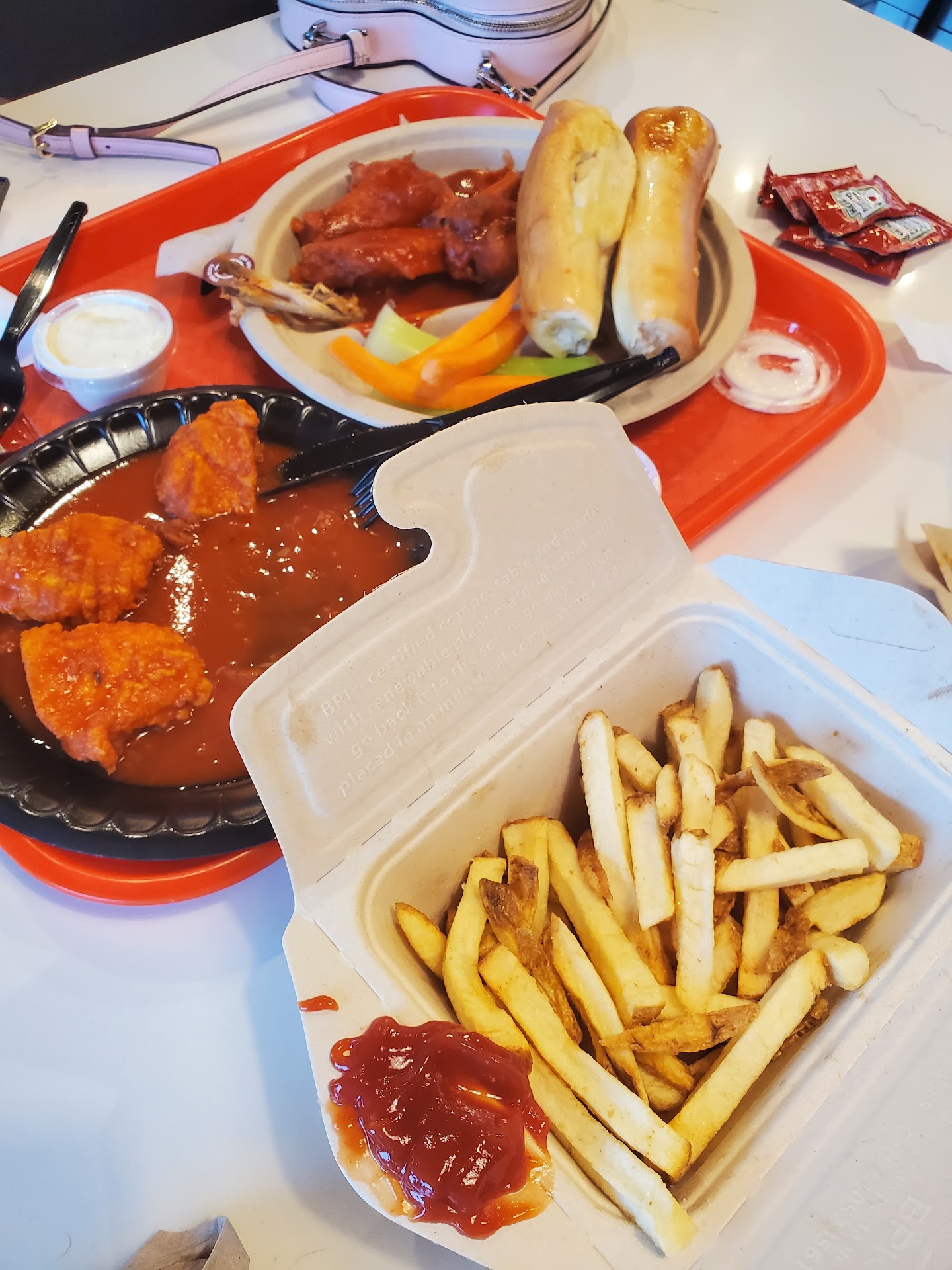 We decided to try this place for our cheat day and we're super surprised that it was absolutely delicious. We had the $1 bone in hot wings in mild, medium, and extra hot buffalo and they were all delicious. Visited with friends as we ate and even taking our time the wings were crispy and hot throughout our visit. We tried the bread sticks as well which were very good, soft, warm, and a little bit garlicky. The kids got french fries which they enjoyed and had to get a second basket, I didn't personally try those so can't comment, the only thing we had that wasn't fantastic was the chicken strips, which although they were juicy when you ripped into them, the meat was somehow a bit dry when you went to chew it. All in all we really enjoyed it and will be back when we can. The food can be a bit expensive depending on the deals but was very worth it! Also all the employees we talked to within were very nice...