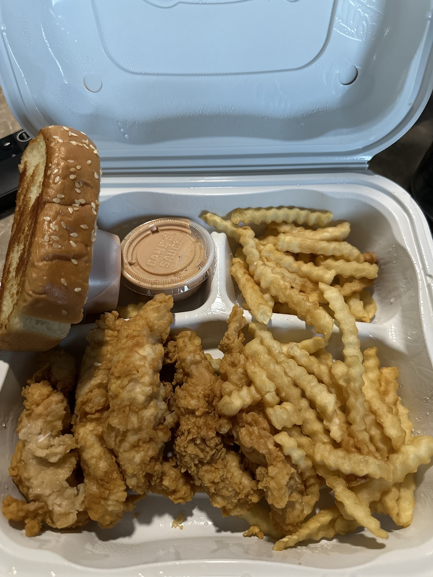 Ā Ā Ā Read moreI believe the price point for the chicken for the chicken is too high, I'm sorry the price point for chicken strips is too high there is no chicken legs chicken wings chicken breast these are all chicken strips. The only had two sauces to go with these chicken strips and as I explain the price point it was not made for a family of four or more due to the fact that the chicken was in my opinion very expensive. The military discount wasn't enough for making me want to go back to it. It is definitely out of my league of what I would pay for for chicken. The service was great the food came out fast it was hot. We couldn't afford the french fries so we just got chicken and nothing else to drink couldn't afford that that was expensive we just wanted to try it for the first time and I do say the chicken was delicious it was juicy but in my opinion it was just not a price point worth going back to Not when I'm trying to feed two adults only but a...