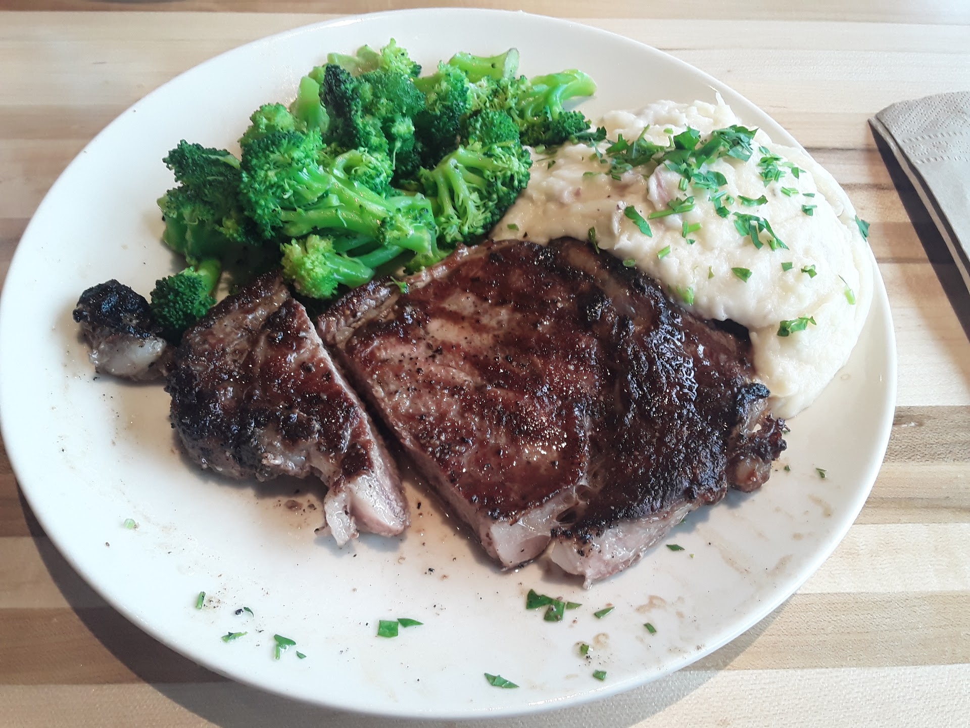 I ordered the 12 ounce medium well done sirloin, mashed potatoes and broccoli. The steak is not overseasoned, but seasoned just right and tastes really good. The mashed potatoes are also very good. The broccoli is tasty, steamed and fresh. The meal was delicious overall and a great pick, especially if you enjoy a nice steak. It was just the right amount of food and did not make me feel overwhelmed. The portions were just right and I did not need a carry out container. I did not even have to ask for a refill. Katie is quick on observations. ; 3