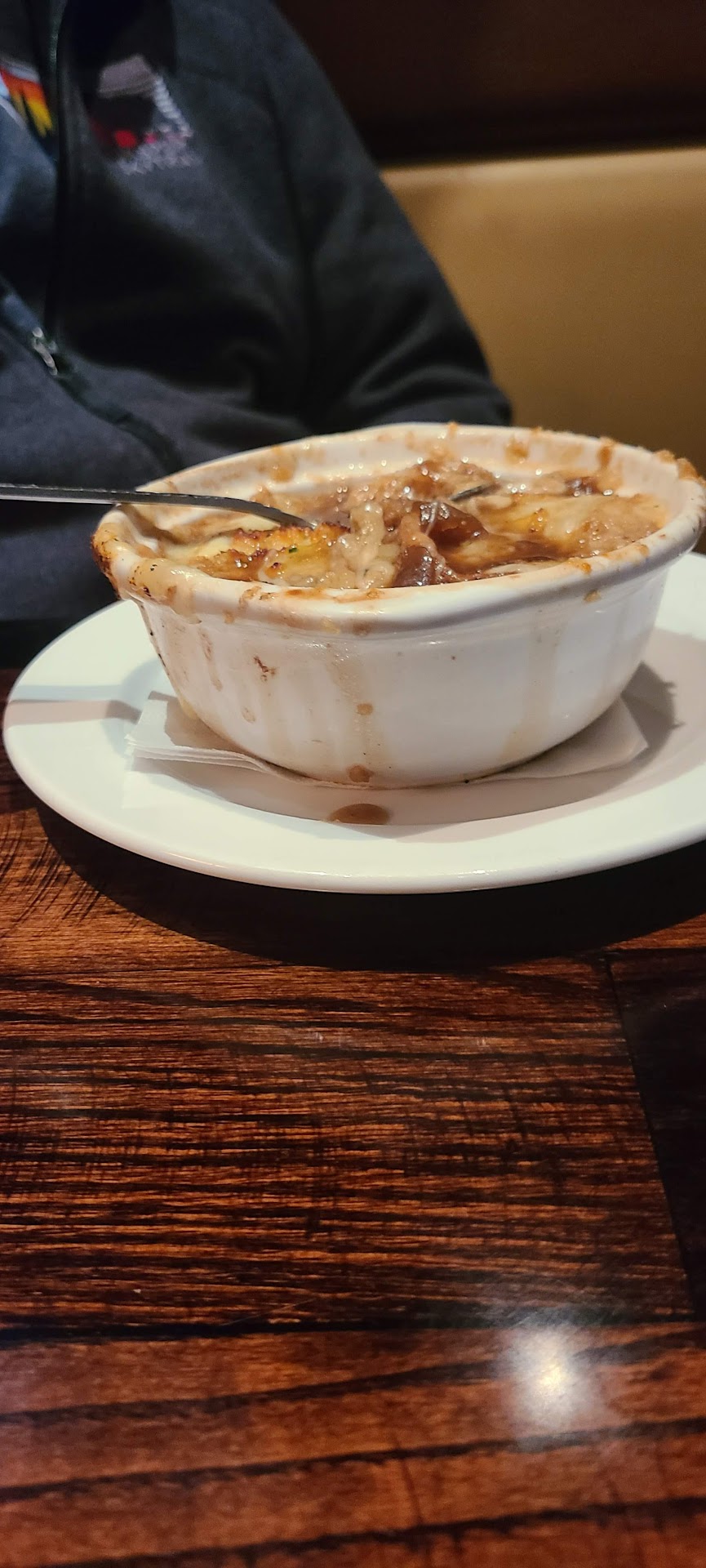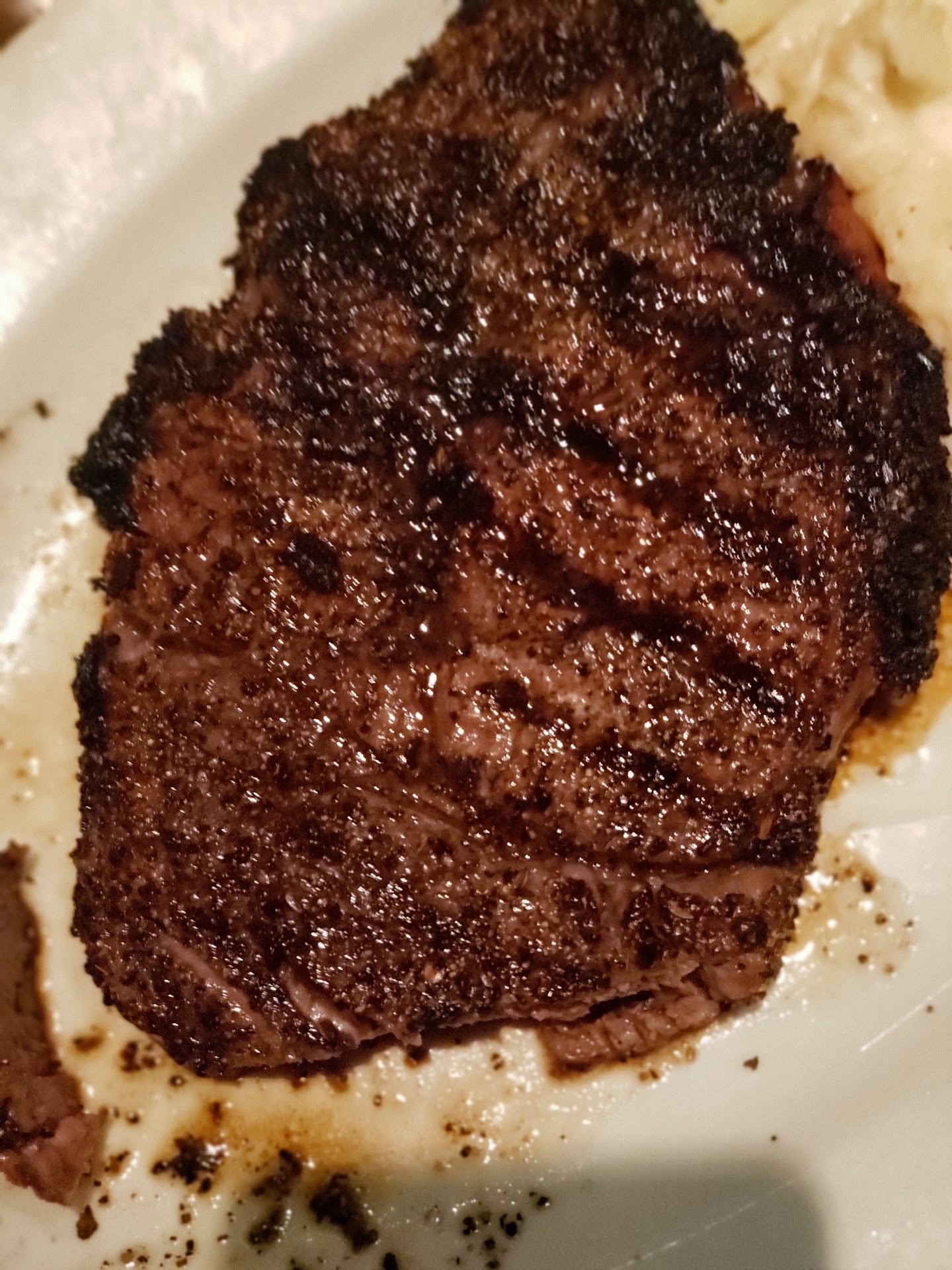 Texas tonion was fairly good. Salad was good, and the blue cheese dressing was fairly bodly flavored, which I enjoyed. French onion soup was good. My ribeye steak was done correctly and was very good. I did have an empty glass of water for several minutes.