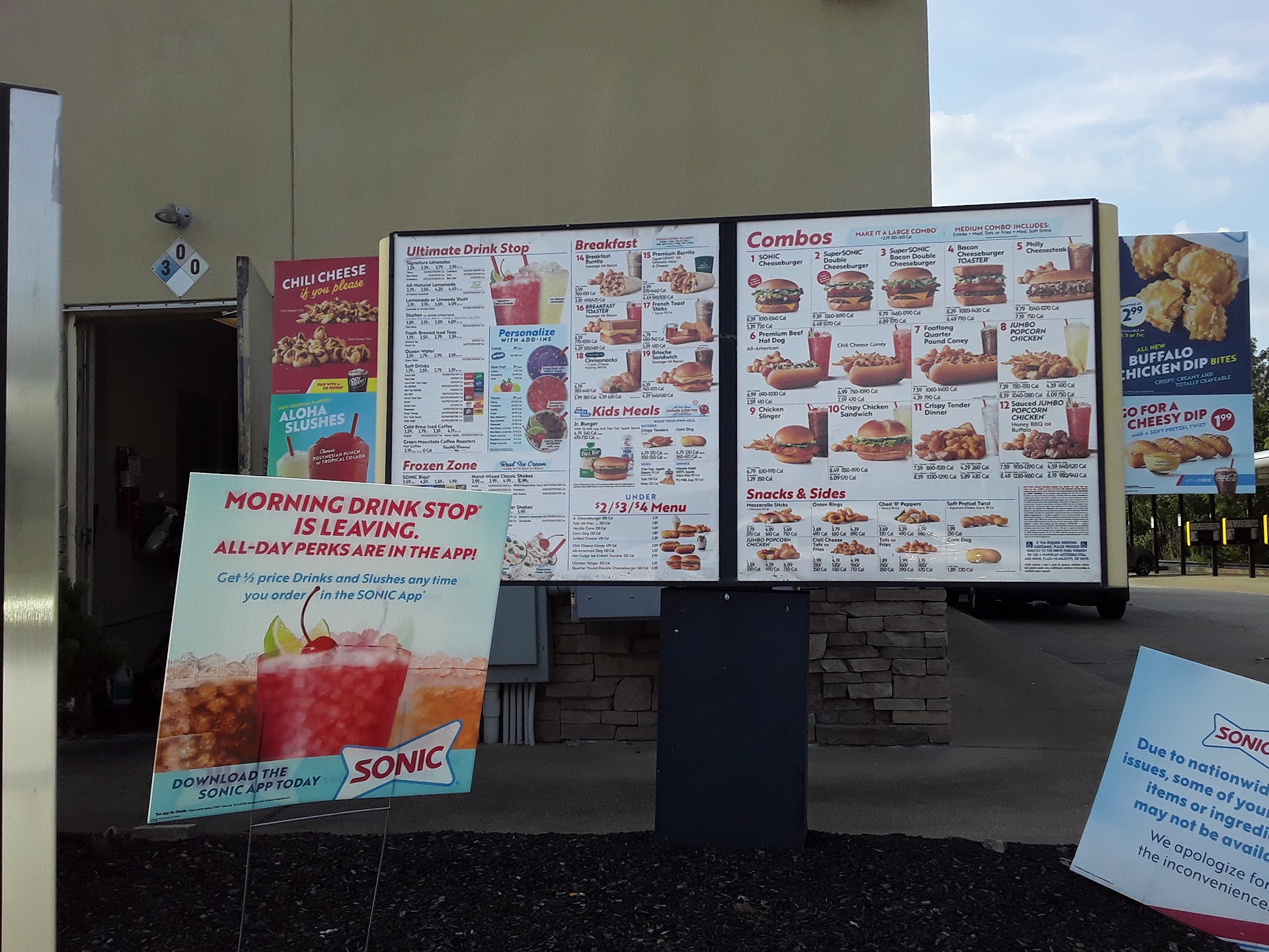 Ā Ā Ā Read moreordered through the mobile app and had ordered a large slushy with add ins with my meal. I didnt know there machine was broken which is totally fine and understandable, I know its not the stores fault. BUT what is the stores fault is the extremely poor customer service training these kids have in regards to the customers. we where given our food at our stall but wasnt told as to why I wasnt given any drink at all and when we tried to ask the server she was running inside. it was raining, again understandable. so I walked to the door and asked about my drink and she just says sorry our machine is broken with a smile. ohkay, fine, but how do we correct this? so I ask if I can just get a pop. and she said we can add raspberry flavors to anything and I said no thank you I cant have milk products and didnt think any pop flavors would taste good with blue raspberry so i just ask for a dr.pepper. she asks if I could go through the drive through to receive my replacement lesser cost of a drink because they didnt want to walk in the rain? I said I dont drive, im the passenger but I can ask and she cuts me off saying do you mind waiting here, so I do. she returns with a regular size pop and I ask if she can do a large being I paid for a large slushy with add ins and still not getting equal value. so she rolls her eyes walks back inside and hands me the most tasteless dr.pepper its essentially colored seltzer water. I do love sonic but ill be going to other locations where staff care about quality, customer satisfaction and job security because the kids working here dont seem to care...