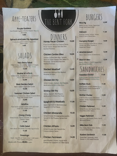 Read moreThe ambience is fun, service was great, and - most importantly - the food was wonderful. We went to The Bent Fork around 5:30 on a Saturday. There was no wait, but many tables were full. My husband ordered steak kabob, and I ordered the spinach salad entree from the specials menu. We also tried the spinach and artichoke dip, the broccoli and cheddar soup, and a pretzel caramel brownie for dessert. The food was simple - with basic ingredients - and delicious. I asked to try both house dressings for my salad, and they were both so good that I couldn't decide, so I split my salad in two and had both! My husband said his soup was wonderfully creamy and his steak was cooked perfectly. The brownie and ice cream we had for dessert was decadent and perfect for splitting. The restaurant's owner was present and involved. We spoke with her before eating and made sure to thank her for a great meal at the end. The service was personable and quick, and the price was very good for the quality of food ($40 for an appetizer, two entrees, two drinks, and a dessert).