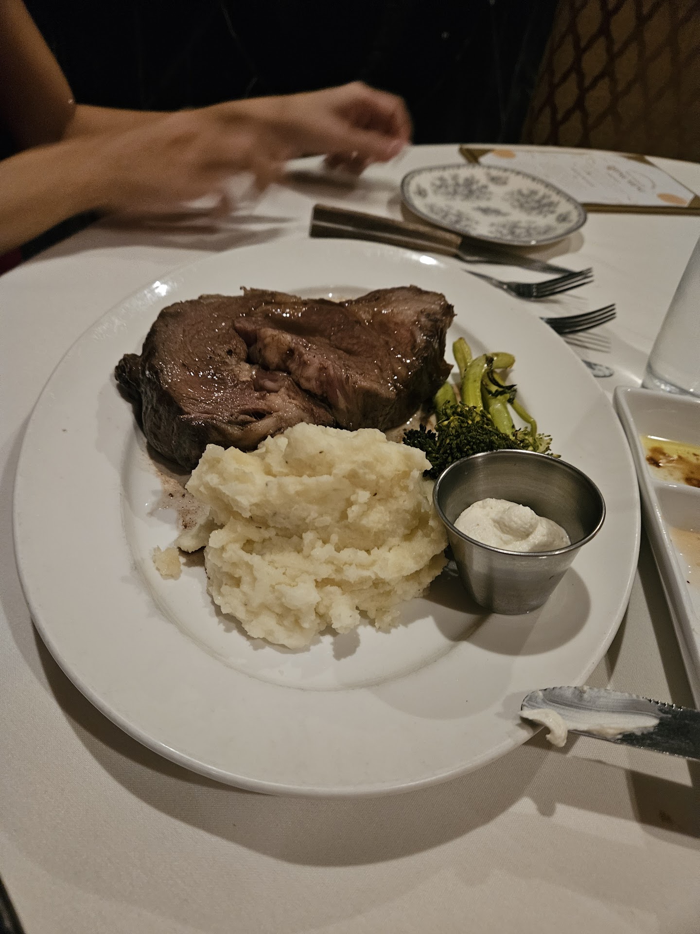 The menu was not exciting. The year before they had a prime rib, it was excellent, it was missing this year. The menu was just really basic and didn't feel like there was anything special for new years on it. We got shrimp cocktail, it was exactly what you would get literally anywhere. We got a crab salad in a martini glass, it was fine. We got the turtle soup, not sure what to expect there, it felt adventurous, it was tasty, +1 here I think, but I have no basis of comparison to know if it was any good. We both got the lamb... It wasn't as good as many places in the area, although the portion was absolutely ridiculously large, like 6 big pieces. Given that it was ~$50 apparently the two pieces I ate could have been had for a meer $18 or so which would have been cool. It's just way too much food for an entree. We were super full so got the chocolate set for dessert, which I think is something good that they have kept on.
