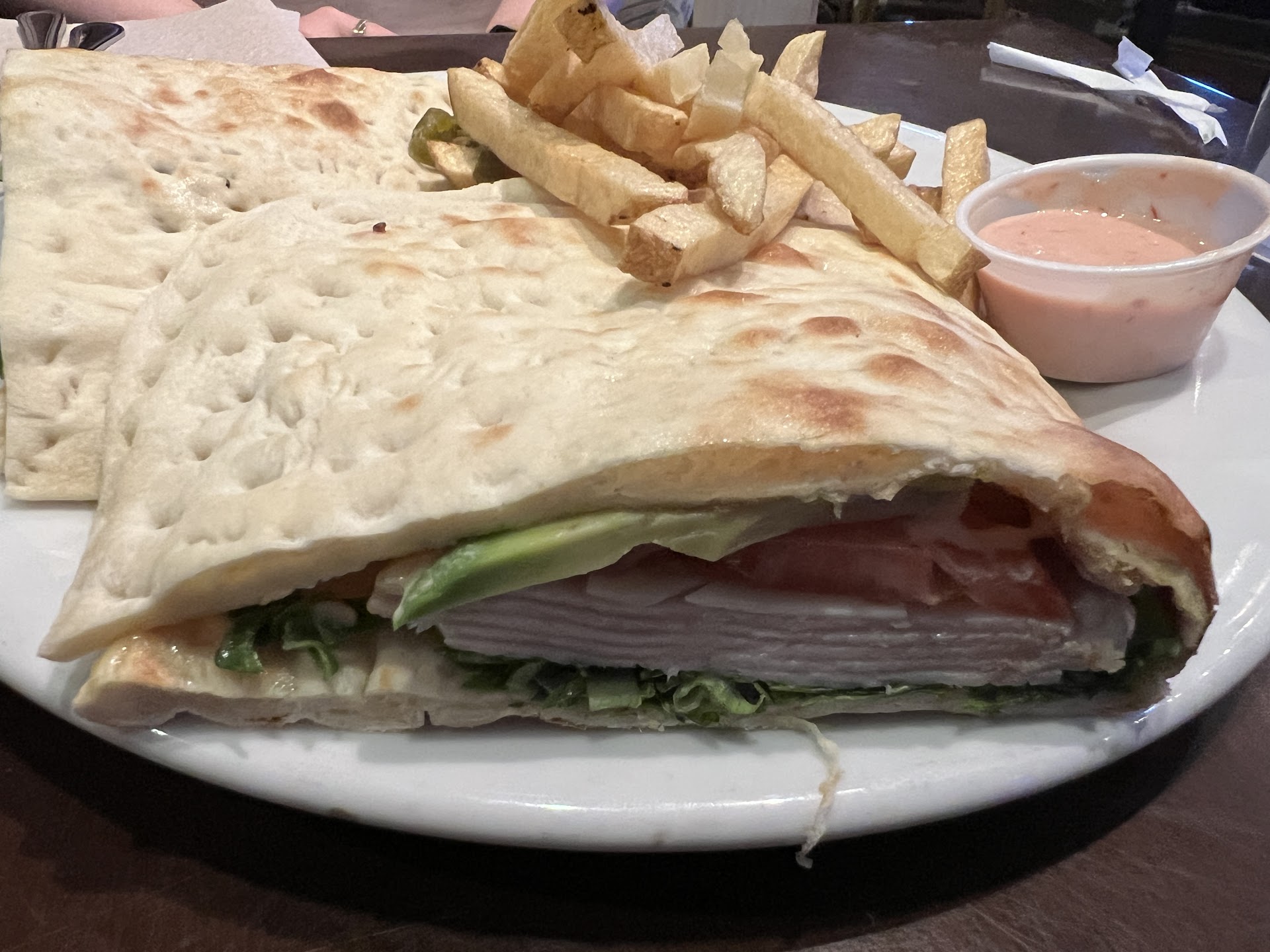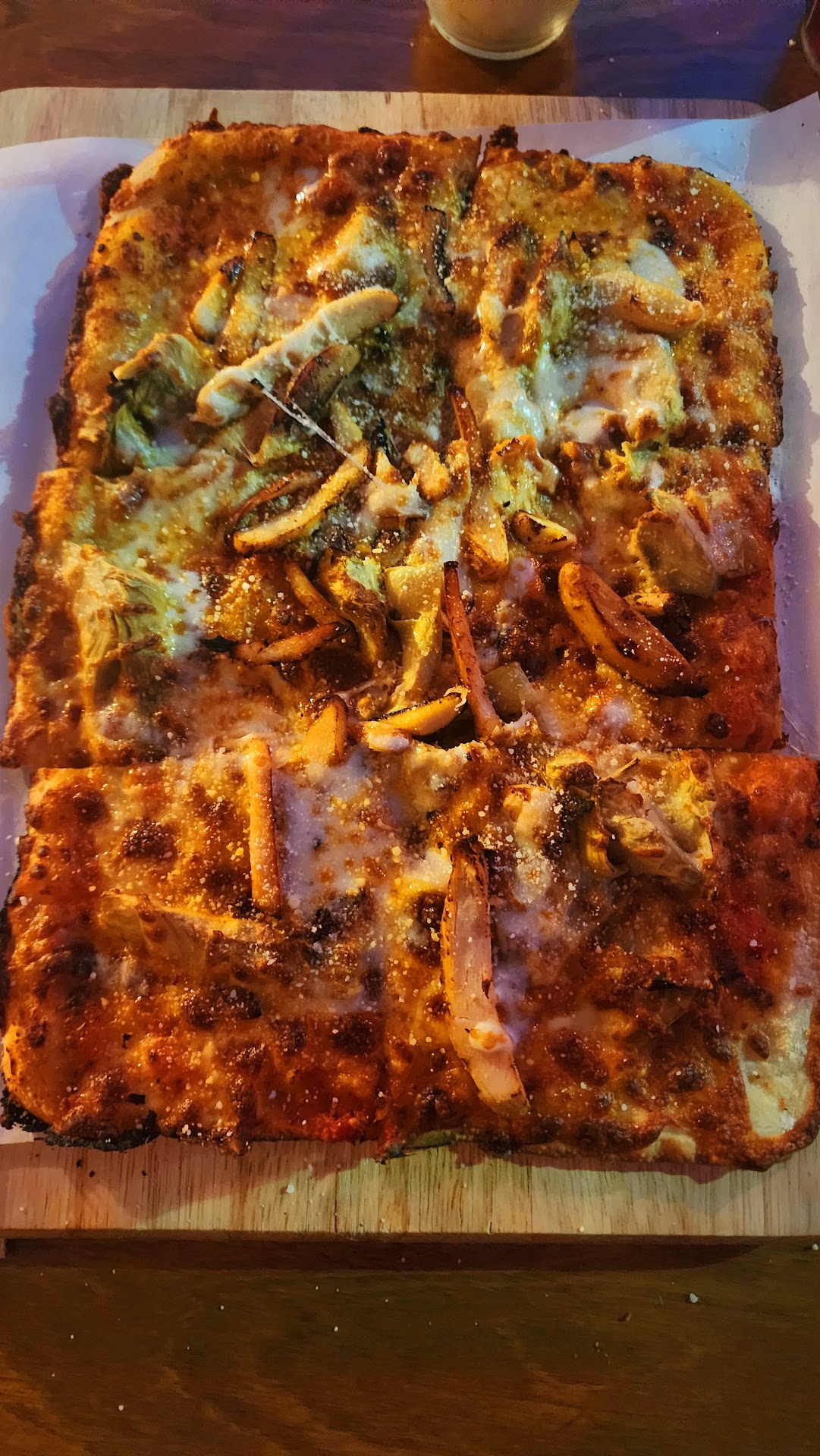 The Happy Hour drinks were generous with the Vodka; and the pizza had a crispy thin crust (my personal preference) served on a square breadboard with serving knife and dipping sauces.
