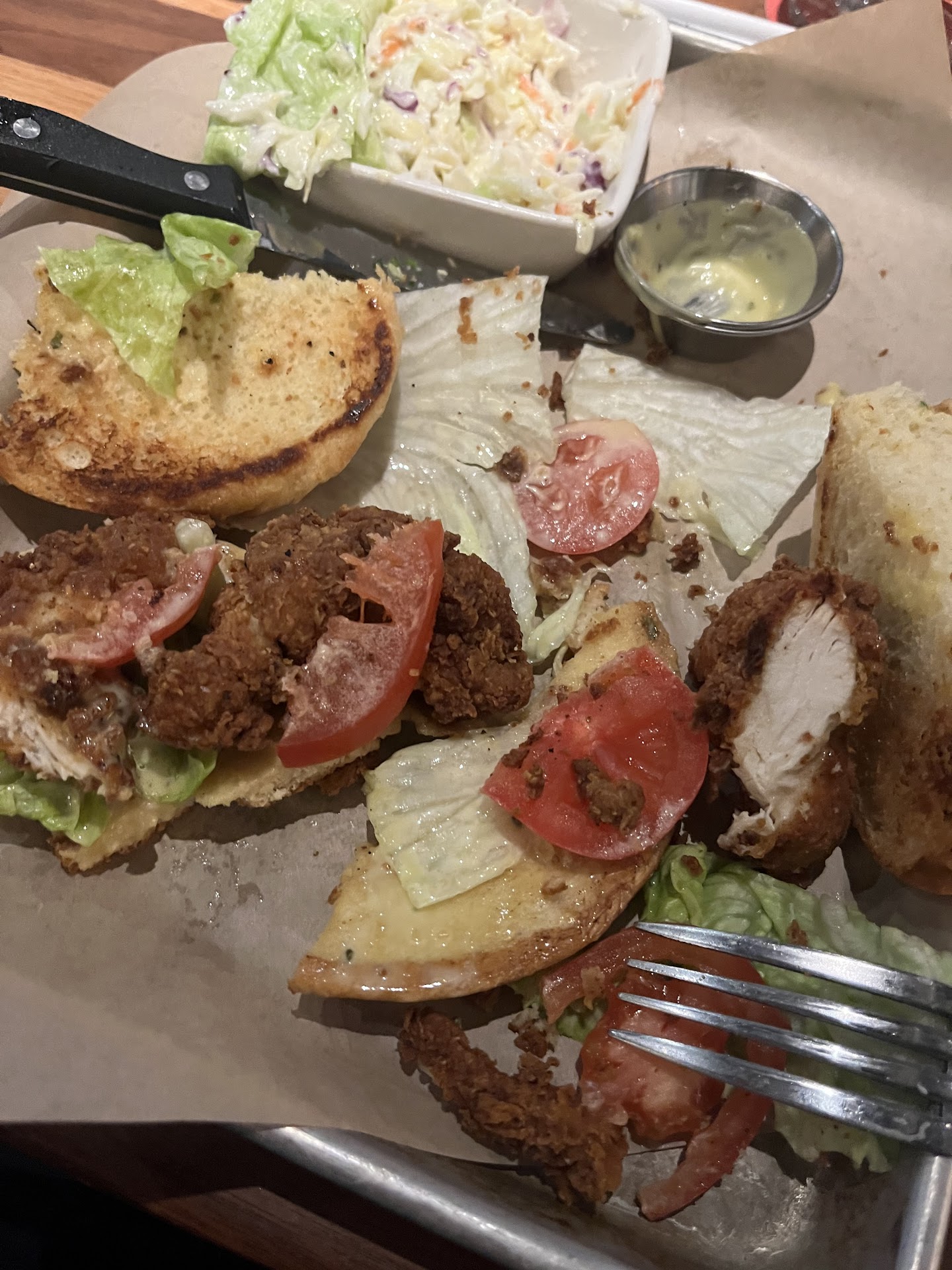 Read moreI’ve been here a lot. I love their tomato mozzarella salad. I had their wedge salad last night that was delicious. I omitted their blue cheese crumbles & substitute ranch instead of blue cheese dressing & had the bacon crumbles put on the side. I got the fried chicken sandwich which wasn’t a fried chicken breast but a long tender that I had to break into pieces to fit on the bun but then it was falling out so it was a pain to eat. It looked over cooked & dried out but it wasn’t. Their honey mustard dressing was really good & their coleslaw is the bomb! Just as good as KFC’s coleslaw. I find the personal pan pizzas don’t always taste the best but it’s a great deal ($7) on their HH menu. I got the BBQ chicken pizza & didn’t see nor taste the BBQ sauce. I asked the waiter if it had BBQ sauce on it & he said it did. When I told him I didn’t see it or taste it he didn’t do anything about it.