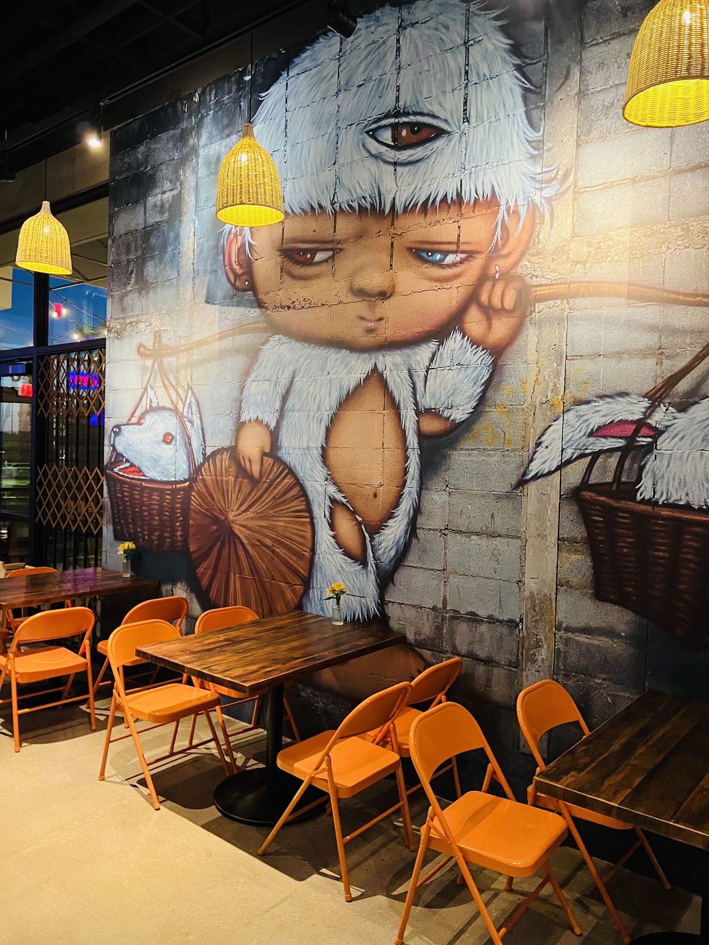 Order at the counter then have a seat. There are tables outside too. I enjoyed looking at the art work and how cute they made everything look. From the tires to the bags of rice.