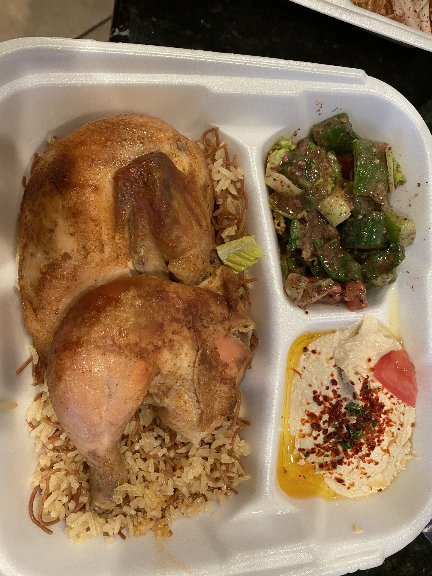 Shwarma fries with everything: thick cut steak fries were warm but not crispy at all, they seemed microwaved. Were not fresh and were not handcut, frozeb all the way. Microwaved frozen fries, yummy. An overwhelming amount of hot sauce, little if any Tahini sauce. Tomatoes were old snd hsd been in a fridge for a while. Generous proportion of meat, but an odd flavor and chewy consistency. Stoppes eating halfway thru.