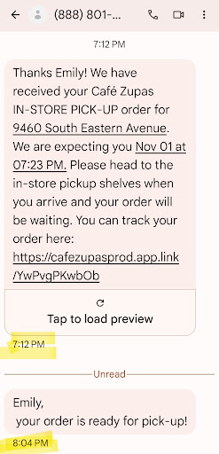 Also, it would be nice if the app could push out order pickup time if they are backed up, or getting high order volume. I would never have ordered and then waited that long had the app given a more accurate time when placing the order. 40min longer than promised pickup time. Yes, 40 min (see texts).