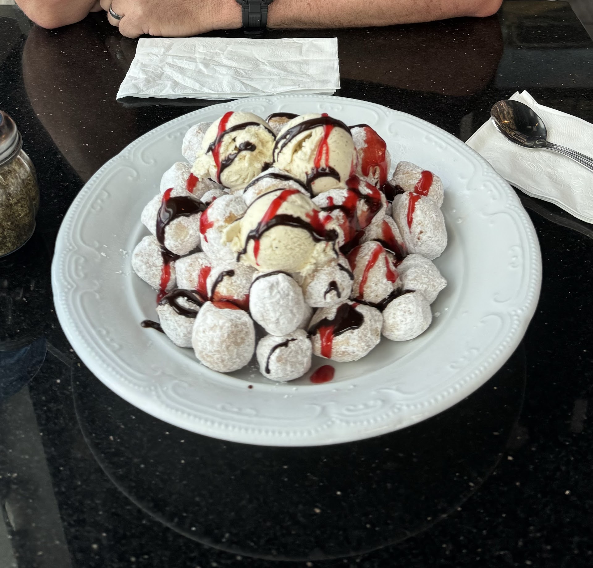 The food was outstanding, and the portions are pretty large. Starter bread was perfectly warm and freshly baked. The Chopped Salad was so good, nicely dressed and delicious! Not over powering. The pizza is a New York style with a wonderful crispness of the crust . All the ingredients were perfectly balanced. The pizza sauce didn't taste too salty ,it was just right. The Italian sub was great. Large slice of mozzarella. Roll was good. The Rigatoni Carmine was delicious. Creamy. The meatballs and spaghetti/meatballs was good. Soft meatballs, great sauce. The zeppoles were fried to perfection with just the right amount of powdered sugar, topped with strawberry and chocolate sauce and served with 3 scoops of vanilla bean ice cream. Yummy š