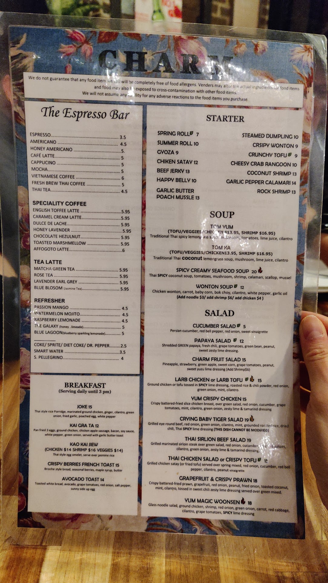 Read moreI want to disclose that i'm a big fan of the food. I love the environment of the place as well. I've visited many Thai places in Vegas and Charm Thai by far is my favorite. I've met the owners before and they are very respectful. But I have a huge issue, which are the waiters. The servers are very inefficient. Ever since I started going there I haven't seen a single good waiter. Lately I have been served from a guy that works there, i'm assuming he is a kid. The first thing that was disturbing was when I asked for chopsticks, he hands them with No wrapper on them and was touching them at the end. Just from that incident my meal was already ruined. For some reason the other waitress opened the door and left it open until I requested it to be shut, which I thought to be strange in the first place knowing that it's very hot outside. It quickly became hot inside the restaurant. Then the food comes, I ordered curry and as the waiter set the curry on the table it was spilling all outside the bowl. As he handed me my rice I noticed the way he was holding the bowl, with his palms over it which is not how rice should be served. At this point I just wanted to storm out. Another thing, he is wearing way too many bracelets that have long strings at the end. It's very unhygienic because the strings are long and it touches the food. Another thing that happened last time I visited was when he was refilling my water, he puts the pitcher over our food and pours the water, and when he is done refilling, the pitcher spilt water directly on my food. He didn't say anything and walked away as if we all didnt notice. The servers at this place are not effecient, at all. Some of them have bad English and no people skills to serve. Like I mentioned before I really liked the food, and the owners are great. The reason why I am not coming back is the service from the waiters. They...