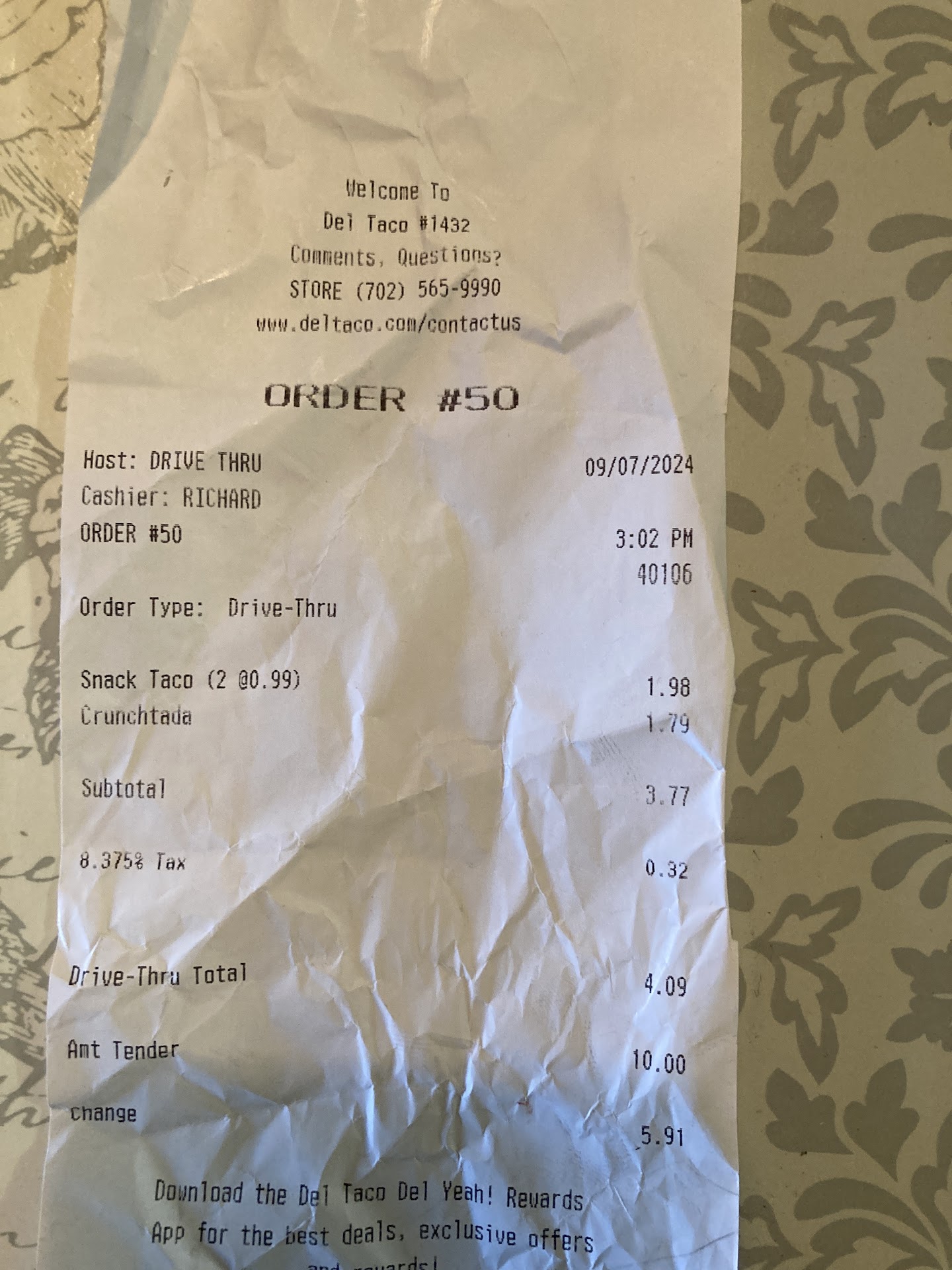 Read moreToday September 7, 2024 store #1432 I was ORDER #50 via the drive through. My drive through total was $4.09. I paid for my order with a $10 bill. The Cashier was handing me my change of $5.91 and dropped $0.81 on the ground. Asked him for my change in my hand and he refused to give me my change in my hand from the cash register a second time. He stated that “You can get out of the car and pick it up if I want it.” It’s 106 degrees outside today. I call the store and requested to speak with the manager. The person who answered the phone said that he was the manager. I informed him of what happened and requested the cashiers name for this review. He stated that the cashiers name is Alex. However, my receipt says that the cashiers name is Richard . He is big chubby guy. Extremely poor customer service experience because of this guy! He needs to be reprimanded and retrained on how to treat customers. I’m the easiest going person and I’m not known for causing trouble. Richard or Alex whatever his name is, motivated me to write my first bad review ever online. I truly hope that he’s not at the window if I decide to return to that...
