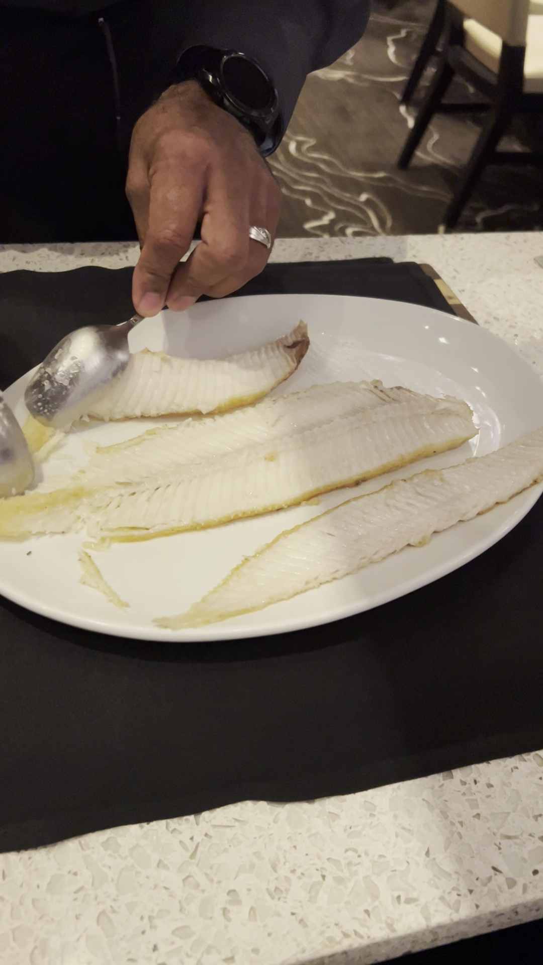 Entrees came, without having my salad, and the special Seabass and Prawns they had and my wife ordered was delivered was so dry, I was able to pick up one corner and the whole thing came up without flaking apart and the Prawns were so overcooked, they would have bounced off the floor. Believe me, I thought about it. My NY Steak Au Poirve was not that at all. It was just a NY with a black pepper coating. When I questioned about the Brandy Peppercorn Sauce, their response, "That's how WE do it." I've got a suggestion, if you don't do it the traditional way, inform the guest and don't charge $6 for a seasoned steak. They then offered to bring out a peppercorn sauce, that would have been nice when I first ordered it. So the GM comes back out, literally 60 seconds later, obviously with someone else's Seabass. And this guy, who looked like a throw back 1980's game show host with the most phony smile ever, never even came back to check to make sure it was done correctly. Even my steak was oddly cooked. First half was just as ordered, perfect medium rare... the other half was medium to medium well, as if only half the grill was turned on. Now, I know we're had a comp, but it was only up to a certain amount. And after all that, and the ridiculously over cooked Seabass, they still charged us for the Special. You'd...