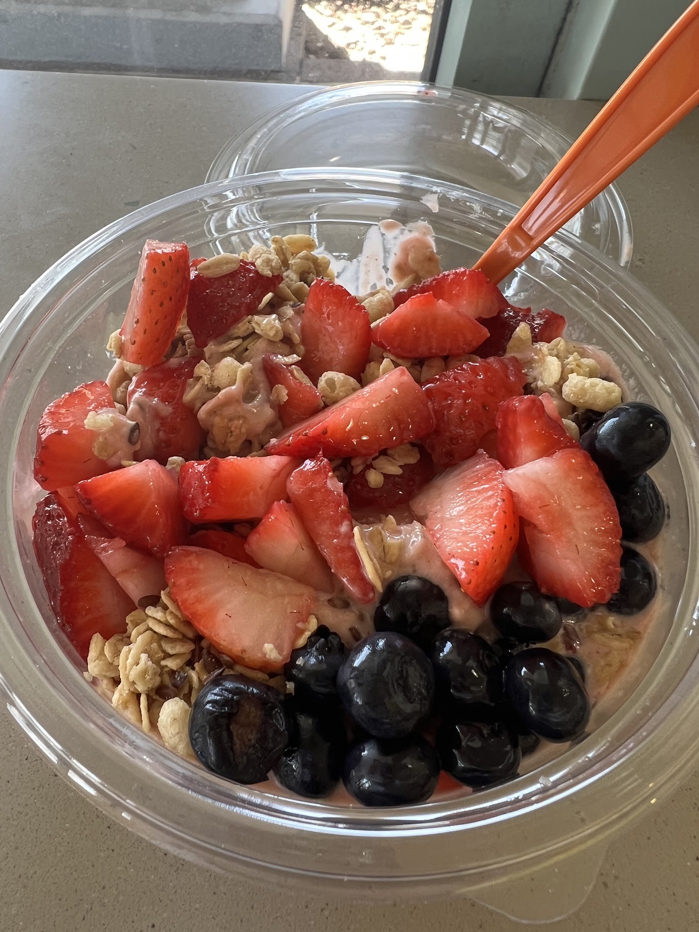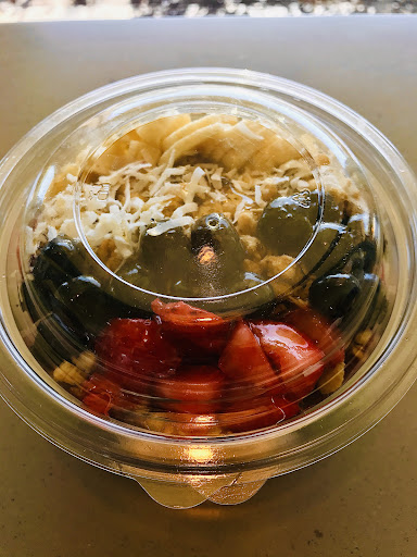 Came in to get a smoothie but saw this on the menu instead and decided to try it. It typically comes with banana instead of blueberry and the girl at the register said she didnāt have banana but I could try it with blueberries instead. I was fine with that because I prefer blueberries. This bowl was so dang good! It has It has vanilla soy milk, strawberries, (usually bananas but substituted blueberries), nonfat Greek yogurt, granola, and peanut butter. It definitely hit the spot and I will be ordering this again. There are three other bowls I will definitely be trying too! A great snack on a...