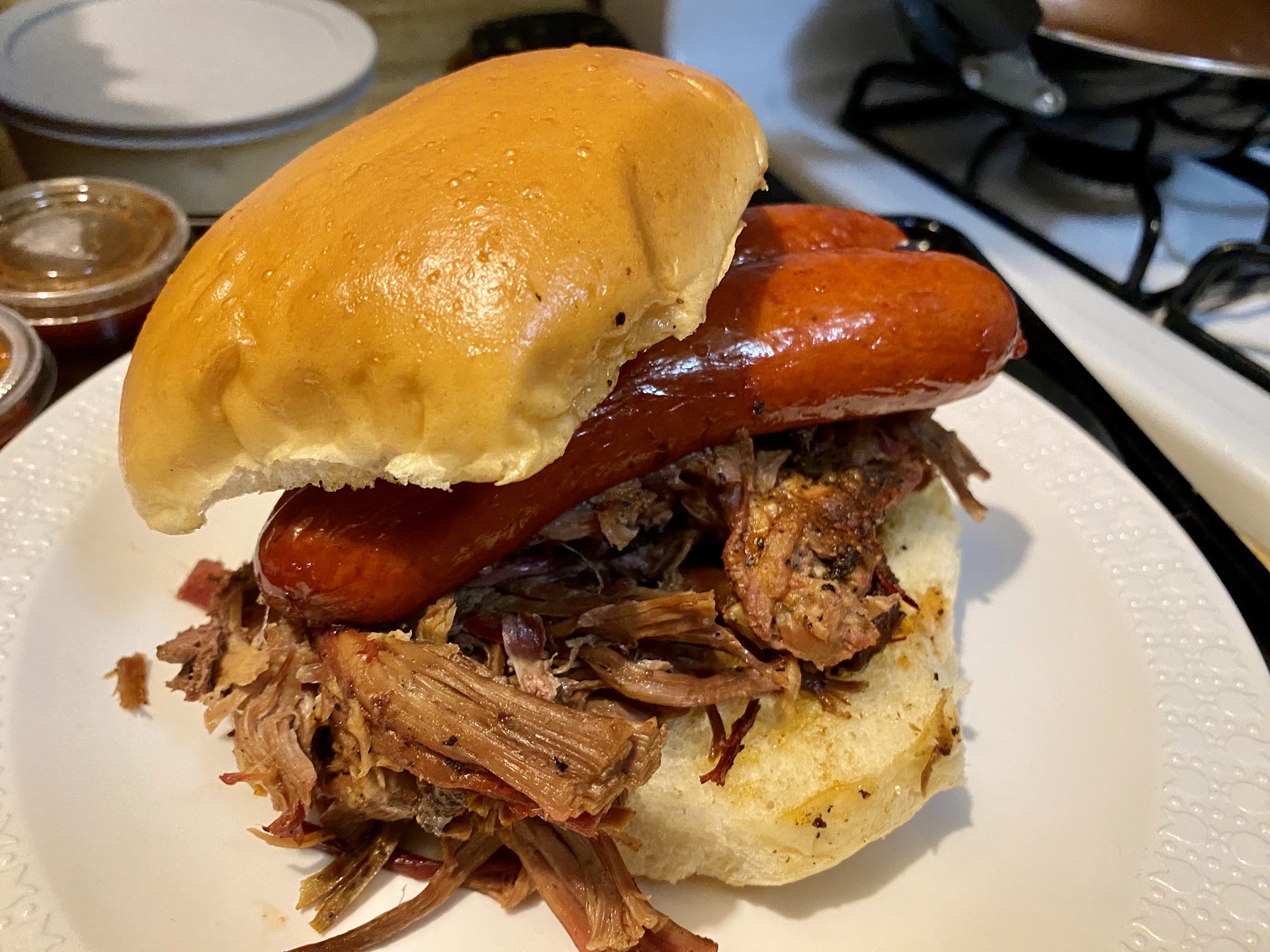 I got my favorite go to , to go , the House of 3 Sandwich , ( Brisket , Pulled Pork , and a Hot Link. ) The brisket this time was better than the last time I had it , it was spot on ! I'm a big pulled pork guy and you guys know how to make it right. The hot link was cook just right with that little snap of the skin. It was so good to have my favorite bbq sandwich again. I like to use a little of different sauces for different things. You have to use the Carolina Vinegar Sauce for the pulled pork , I'm from South Carolina. The brisket is good with no sauce and a little dip in the God Sauce sometimes. The hot link is the God Sauce.