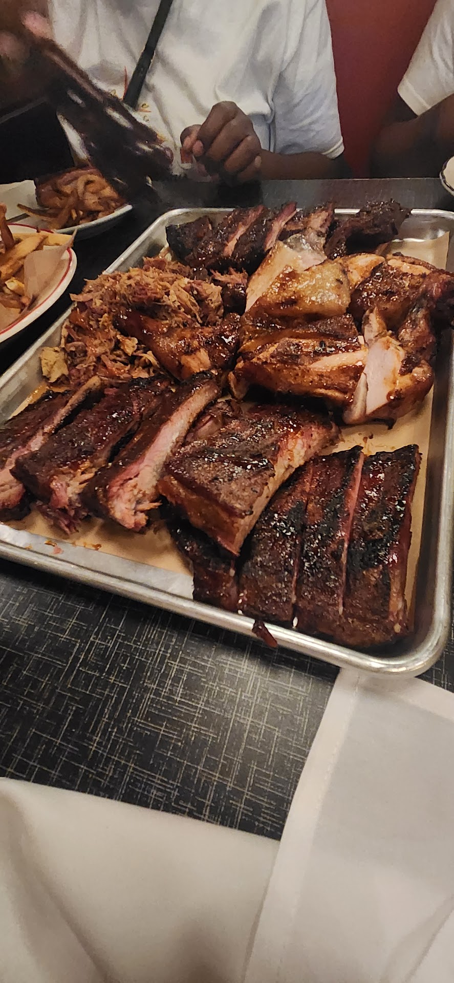 I ordered a plethora of things in a menu item called The Family Supper. There was so much food! Did I mention how much food there was? I'm sorry, but I neglected to mention that there was so much food, that the four of us did not finish it all! There was enough food on that gigantic platter to probably feed 7 or 8 people, maybe? The platter came with several St. Louis style ribs, pulled pork, greens (that needed a bit more seasoning), grilled/barbecuedchicken, and perhaps one other protein.