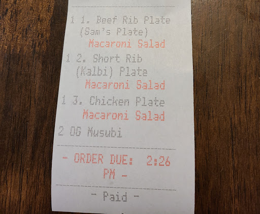 the bad - the chicken and steak we ordered were very dry, we couldn't finish it - the rice was dry, almost bullets - i was very disappointed. I also ordered a couple of beef ribs, almost no meat, one of them had a 1/2 bite of meat and all fat - the last time I had them it was soooo much meat that I couldn't finish and the chicken, steak and kalbi were soooooo ono!!