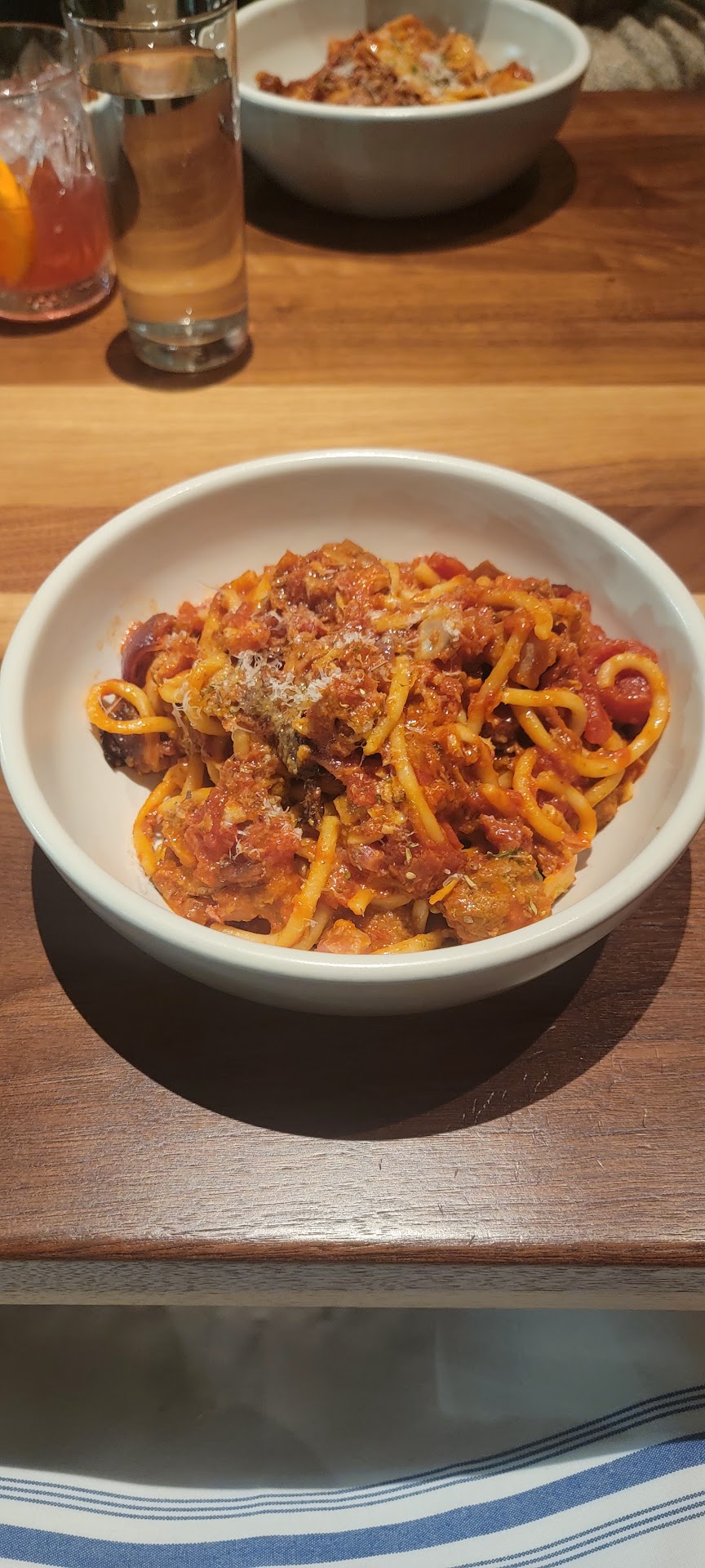 Then the bologneseâŠnot what we expected. Usually bolognese is a thick meaty sauce with traditional noodles like spaghetti or penne. Here the noodles were flat and wide like a thin lasagna noodle. Thatâs fine but the sauce needs to be thicker. Sauce was thin, too thin and not meaty enough. The big issue was how similar tasting the sauce was to chef boyardee. Not trying to be mean but all of us who tried it ended up smiling at how closely it tasted like boyardee ravioli which I eat but donât want to pay 26 bucks for. We exchanged it for short ribs.