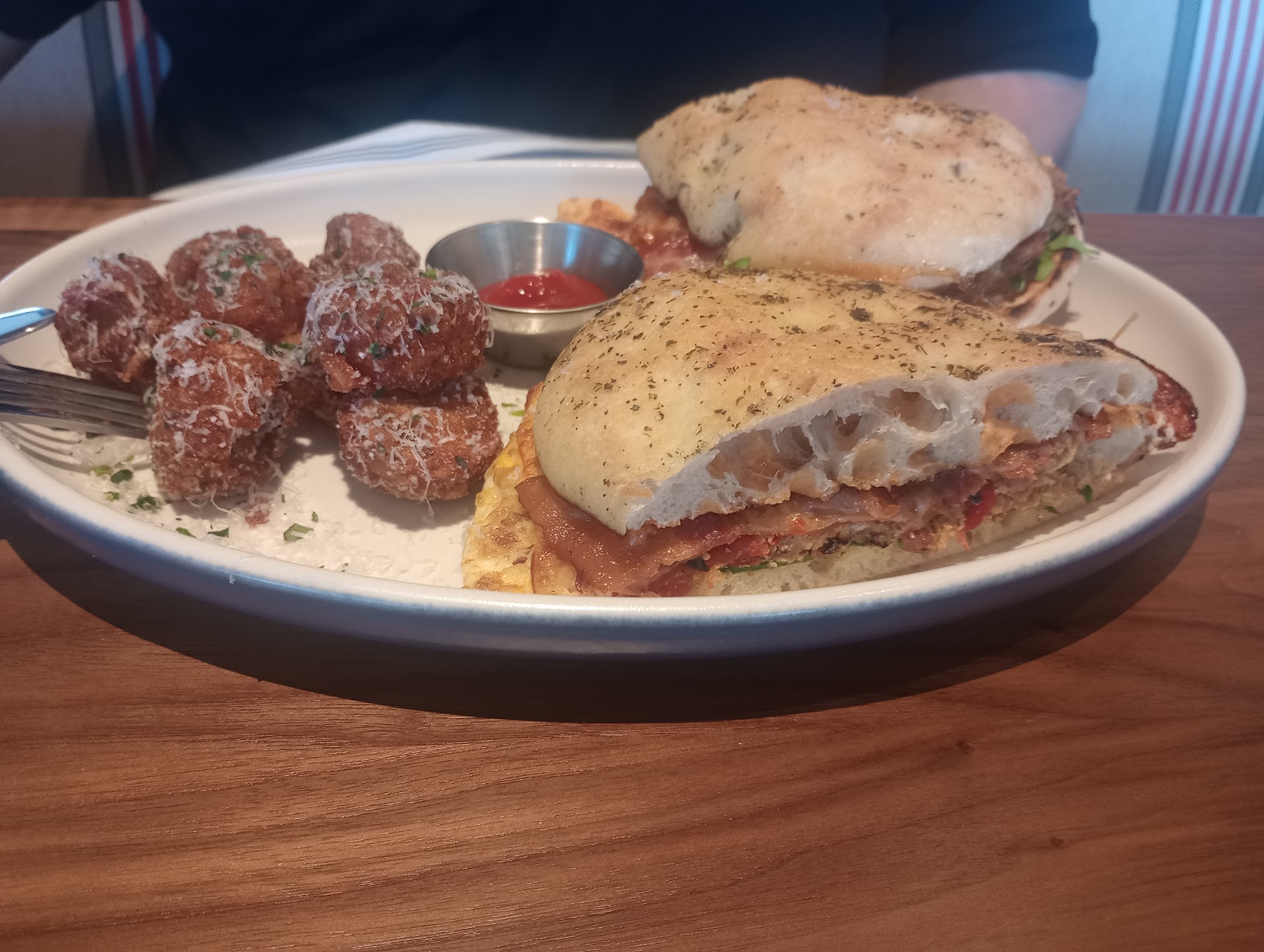 The ambiance was nice. It's light and airy, with a lot of windows and beautiful natural light shining through. Our waitress was also pleasant, and I didn't catch her name. My husband was not impressed with her from the very first interaction, but I like to give waitstaff some grace especially when they just opened a location.