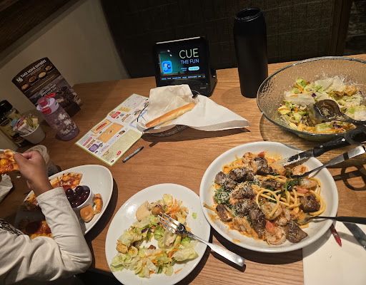 The overall vibe and atmosphere in the restaurant was utter chaos. Things dropping constantly, flustered wait staff, and loud noises. This is either the result of poor management or just clearly unqualified staff. We may not be returning ever or at least for a long time, which is a disappointment, considering we would love to have a reliable Olive Garden...