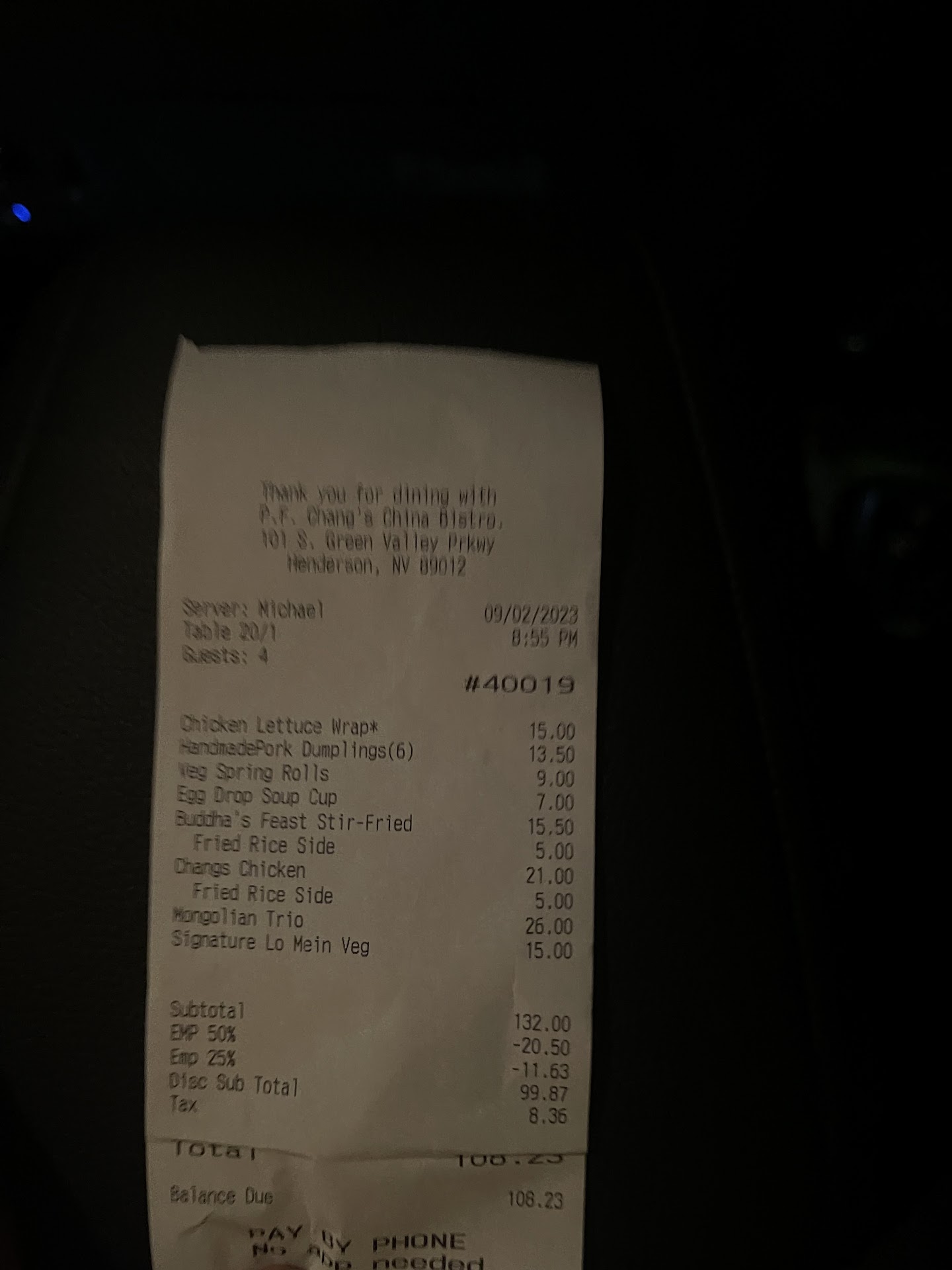 Read more“BEWARE”! WORST FOOD AND SERVICE I wish there was an option of NEGATIVE Rating. I usually don’t write bad reviews but for the safety of others who are going to this location and spending there hard earned money. Think about it before visiting if you are are not “WHITE”. Our friends from California raved about PF Chang food so we had to try. Our experience started with a great host. She was very welcoming a Perfect example of Customer service. So the issue starts as soon as we get acknowledgment from our server “MICHAEL” as you can see he is looking down on you every-time you are asking a question. We ignored that part and placed our food ordered happily. Food Issue: we ordered Egg drop soup (not hot as it should be) we didn’t say anything, Spring Rolls were okay and Chicken lettuce wrap were okay. Appetizer were not bad but the main course took half hour to come on table and brought cold as if it was waiting in kitchen for so long and it tasted bland (Mongolian Trio, Chilly Chicken, lo Mein).