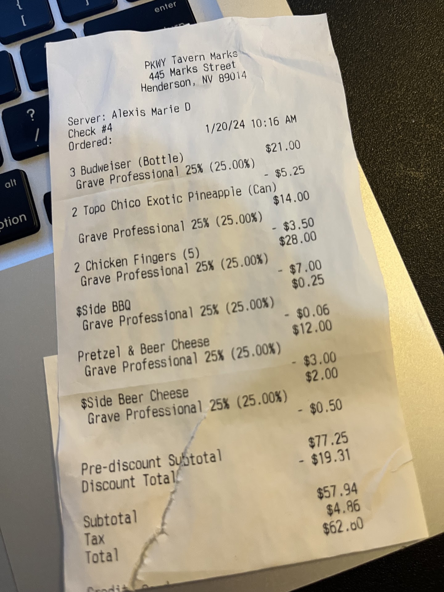 I did mention before ordering food that I was a healthcare worker since they give us a 25% discount off of our bill. I then showed her my badge. My friend & I were both gambling while we were here. I put $20 in my machine & lost it so I put another $20 in. I got 2 Topo Chico while I was here which normally they will comp you your drinks while gambling. Some places will do one drink per $20, but this place hasn't always been like that, as long as your gambling they will give you free drinks. My friend had $100 in the machine & took it up to $130 plus some change. He got 3 Budweisers while here. Well guess what happened when our bill came?? We BOTH GOT CHARGED FOR ALL OUR DRINKS. I asked if they don't comp drinks anymore while gambling?? Mind you we were @ a different Parkway Tavern location the night before & all our drinks were comped. She told me "no, you get charged 2% of what you gamble for your drinks." LIKE WHAT?? What the heck was she talking about??? I've never heard of such a thing & if you look @ my receipt we didn't even get that discount. We only got the 25% healthcare workers discount. This was sooooooo messed up. Like what in the world? This girl is all sorts of things that I don't want to say on here because I don't want to be mean but I hope management reads this & addresses this with her. I don't plan on coming back here...