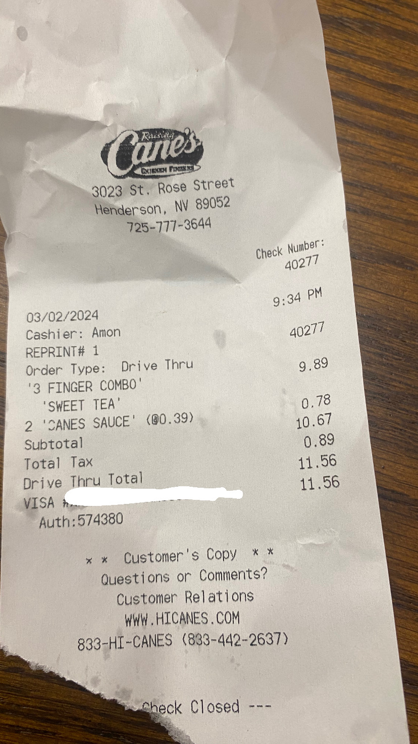 Ā Ā Ā Read moreMy family and I come to this location often. In late September we ordered 5 caniacs in the drive thru. We went home and all 5 of our fruit punch drinks were basically pink water and we were missing our cole slaw. I called immediately and spoke to a really nice manager and he stated heād give us 5 caniacs when we came back because theyāve been having issues with their drink fountain. He was very apologetic and super sweet. I wish I wouldāve gotten his name. He mentioned that I didnāt have to redeem the caniacs right away and could come back whenever and that heād put my name and number down on a list. I called two weeks later to give them a heads up that Iād like to come in and redeem the free caniacs. They couldnāt find my name anywhere and I spoke to a general manager who said heād have to investigate further and he would reach back out to me. I gave him exact dates/orders but I wasnāt advised to keep a receipt since my name was already written down but I could easily pull up a bank statement. Itās been a month and a half since I spoke to the general manager. Iāve called three times since then for an update and I keep being told that the general manager will reach out to me when heās available. Iām bummed because my family and I love Canes, especially this location until this entire ordeal. Iāve received no follow up, no resolution from the initial issue and no resolution from them giving me the run around. Overall, a really bad...