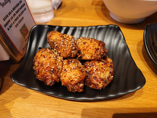 We ordered: Takoyaki Tebasaki wings Ebisu ramen with a side of garlic chili oil Cold ramen, with yuzu dressing, sub with thin noodles