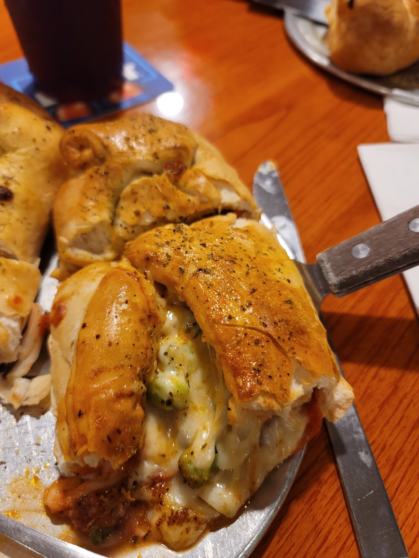 The view can't be beat, especially at sunset! Deluxe pizza was excellent (another example of the "Una" style thin crust that's popular in this area). Regular stromboli was super tasty. The appetizers we tried were straight from food reseller bag, though (fried pickles and mushrooms). Companion had grilled chicken salad and it was all gone when we left so I take that as a good sign! We also shared some hot chicken wings. There was a good amount of meat on them but neither of us cared too much for the taste of the sauce. We like heat AND flavor and this was mostly just heat.