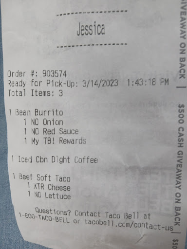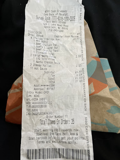 Read moreUpdating my review to 5 stars because the last visits over a couple months, they seemed to have fixed their issue. They were dumping everything, including the box combos (when they ran out of boxes) into the same bag. We were never able to figure out what was a bean burrito or a 5 layer, or any similar item from the next, without opening everything. The wrappers, the way they're labeled, show 2 potential options on the corner and nothing circled as to which it was. A BIG problem when you're buying both options, and this problem was going on 2 years or more. There had been no way of knowing you got what you ordered. We were shorted many times. We pick up Taco Bell before heading back out the lake route home an hour plus away. So there's no recovering the loss. We spent approximately $68 a trip. Luckily, the last 3 trips they have been using the boxes, and I hope this is a sign of a permanent change of practice. I hope if they run out of boxes again, they will continue to put each "box" combo in its own bag, and individual items purchased have the specific item circled in the fold to clarify what it is. The customer service, as far as friendliness and speed is always good at this location. It is the closest to our route so we always opt for the location for purchase. When you get the right food it's fresh and very good. The only complaint as to food is o. The occasion I have a friend with me who loves a bean burrito with extra onions ... They never seem to add the extra onions. I don't know why that is. Some times it's the only bean burrito we get and they have marked it on occasion, so I know it's the right one, but the onions seem to be the standard amount. We appreciate that they have improved their practices, and hope this is carried...