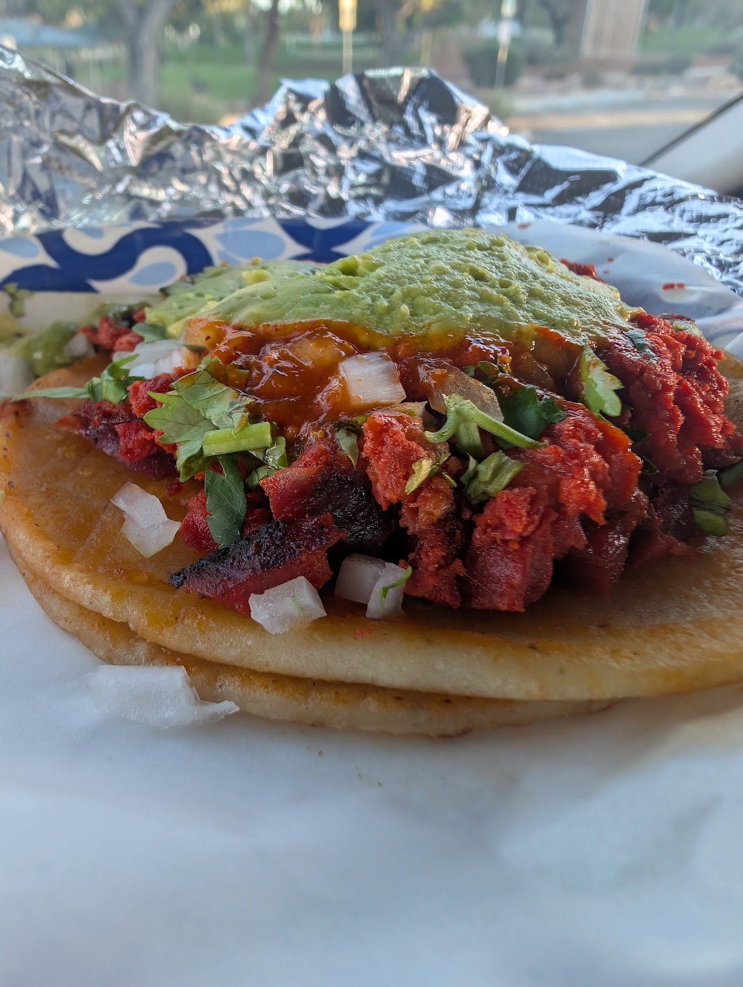I was really looking forward to trying Tacos Pauly, especially with Pauly C's name attached, but unfortunately, it didn't live up to expectations. The al pastor was the biggest letdown. They have a rotating "adobada" spit, which usually means fresh, flavorful meat. However, what I got was clearly not cut fresh. It looked like a completely different meat and was incredibly greasy, almost as if it had been sitting in its own grease for a long time. It definitely wasn't good.