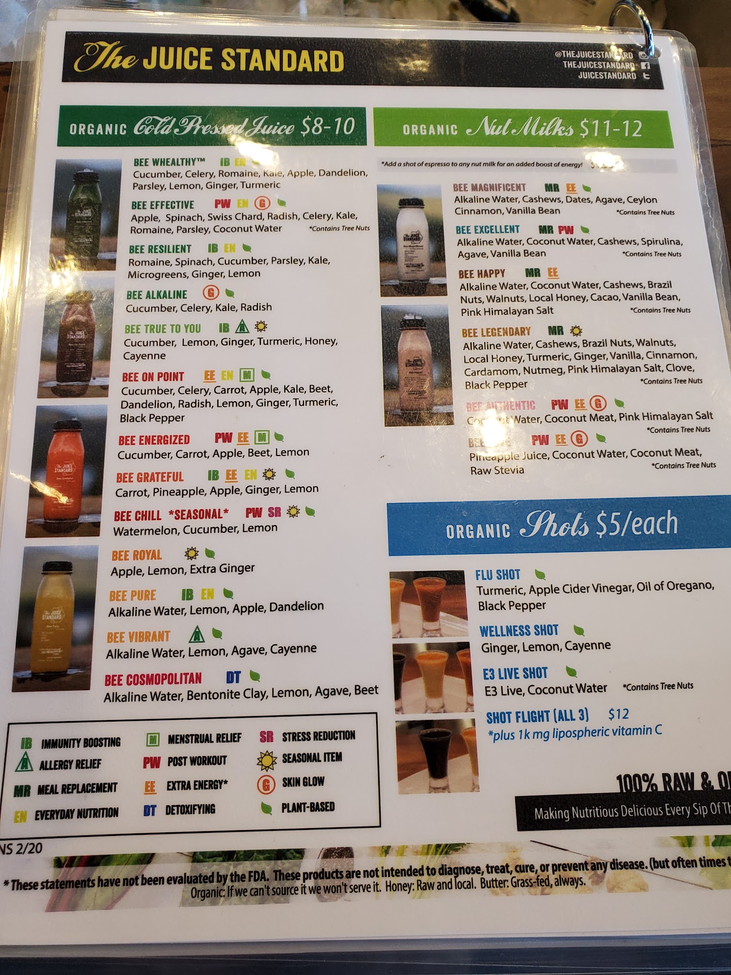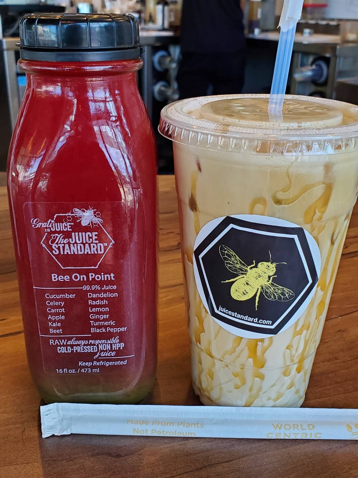Read moreI'm gonna pile on to all the great reviews! Flew into town and did a YELP and Google search for top juice bars... nothing really met mt criteria, except for The Juice Standard! Walked in and was greeted with such a warm and friendly person. Was offered to try a number of samples which were really appreciated. Settled on 2 juices and a shot of ginger, lemon and cayenne! Wow, everything was so tastyand fresh. Sat at the bar as it wasn't busy and just chatted with the 2 employees as we enjoyed the ginger shot and our juice. Weren't able to try other menu items but is very likely that their food is fresh and delicious. What an incredible experience and thanks to the employees and owner to bring this store to such a great experience for me and my wife.