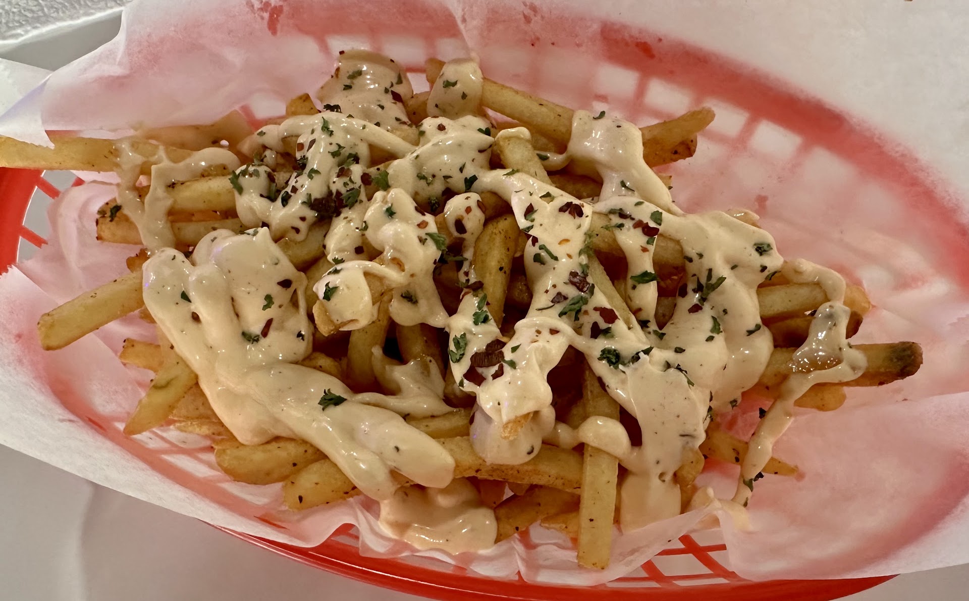 There were several good choices and we were having a difficult time deciding how to moderate our amount of food for a midday meal. My wife spotted the Zeus Fries on the menu and, after getting a description, we decided to split an order of those. It was composed of fries topped with a mix of beef and lamb plus tomatoes, red onion, feta and what they called Zeus sauce. The latter was a spiced yellow cream sauce that was very good. A serving of this was more than enough for two as it was flavorful and on the heavy side. I also had a Greek Coffee, which was nicely done and my wife had a Refresher, which was a light, fruity drink that was appropriate for the 100-plus degree day we were experiencing at the time. For dessert, there was a Dubai Truffle that we had our eye on that was also big enough to split. That was a nice finishing touch.