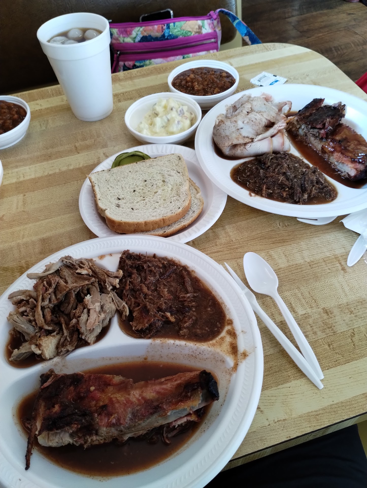 Read moreWhen I left the car I could smell the hickory smoke from the car. We ordered the sampler's so we could try multiple meats. The chip (mutton & pork mix) was best as a sandwich to my taste. The pork, ribs, and turkey were moist and not dried out as is often the case at other BBQ places. Flavors were good. Baked Beans were spectacular. Chocolate & Coconut pies were very good and had a light meringue top. The chocolate was a very deep chocolate flavor. The samplers provided enough meat for a second meal the next day. The pie was eaten much later that day because we were stuffed. Seating is minimalistic with a few booths and a couple of chairs. Now if they would just bring back Diet RC! I want caffeine in my cola. The smell f the hickory smoke...
