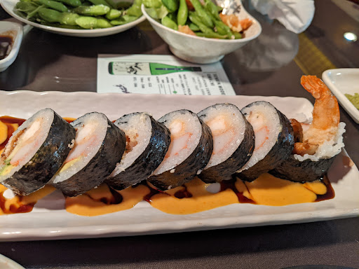 Food Portions are good. Tempura Shrimp were excellent and fresh oil was used on it and all other tempura we ordered. Put your tempura orders together, and they will come out at the same time. This food is a cut above however both in preparation and presentation. Edamame was large and salted perfect. Our Salmon collar steak (pictured) was large and had fantastic seared flavor. Take a look at the online menu (ZMenu) and you will see a great variety here. This is not simply a Sushi Roll shop and offer some very expensive Kobe and Sashimi offerings. The Roll menu is a bit smallish, however the Tokyo Boys Roll and Dragon Roll (both pictured) were very tasty and filling. I found the Grilled Eel to be super tasty here. Food always arrived promptly. They have a good wine and beer menu.