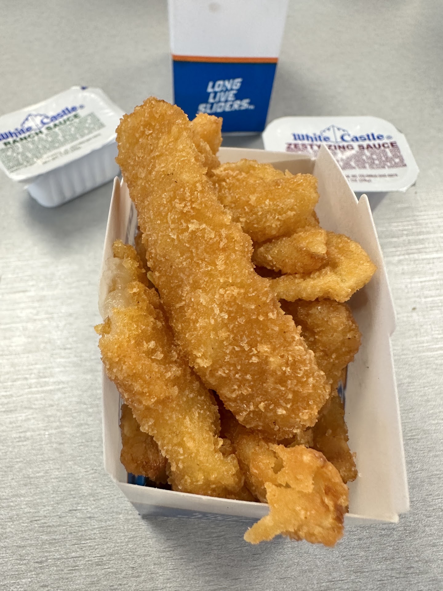 This was our second visit. The two stars are for the onion chips. There was no line in the drive thru but we went inside. Workers were walking back and forth but no one stopped to take our order. It was at least 8 to 10 minutes before someone came to the register. In the mean time cars pulled into the drive thru and their orders were taken right away. We waited 15 minutes for our order. Mean while order after order went out the drive thru. We were told they were just waiting on a fresh batch of onion chips 3 times. Apparently they have a long fry time. We finally get our 10 white castles with cheese and our large onion chips. Oh buyer beware, their large is like a small fry from Mc Donald's. I miss the sack of onion chips but will remember to order more next time. Yes the onion chips were hot and fresh but the sliders were luke warm at best. The cheese was barely melted. I stood there and watch them pull fresh sliders off the grill for the drive thru but ours came bagged up from around the corner.
