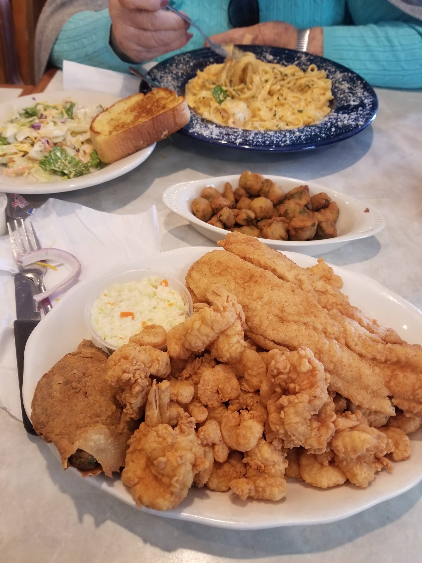 Read moreDecided to try this place since we had seen it in a magazine earlier in the day, we were in the area, and our theater plans fell through, giving us the time to dine comfortably. It would be nice if they served alcohol, but that didnt take away from our experience. They were pretty busy. The place is large, so the wait for the food seemed a bit long. Maybe I was just hungry? It wasn't overly long I don't think. Anyway, when our food came, my wife was a little disappointed that she had no hush puppies on her plate, but didnt want to fuss about it. Our portions were large and delicious and we ended up with a doggie bag and we don't even have a dog at home. 🤪 Guess I'll just have to enjoy it again for lunch. In any case, as I was eating my ton of popcorn shrimp, which I loved, I decided to try a bite of one of the onion rings. OMGoodness, these aren't onion rings, they're hush puppy rings!!! I had to tell the wife. She was so happy. So, all in all, a very delightful experience, with good seafood. She had catfish, jumbo shrimp, & clam strips with a side of okra, while I had Grouper, popcorn shrimp, & jumbo shrimp with a side of cheesy grits. It's making me hungry again just thinking about it. We'll definitely be back. Finally made it back and the food was just as good an now they serve alcohol. Had a hard cider with my jumbo stuffed (with crab) shrimp. Didn't let the ringed hush puppies fool...