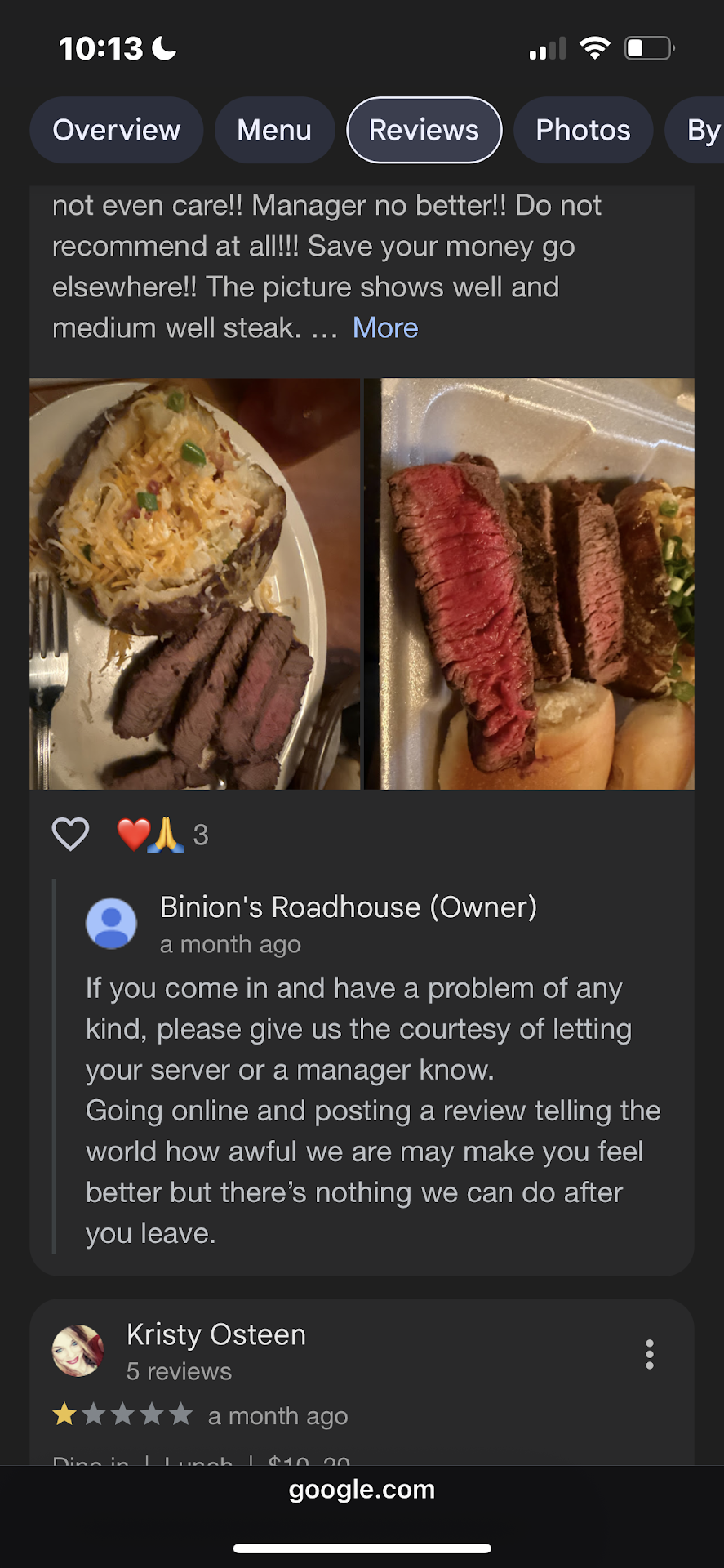 Well sir we did just that and asked the hostess to let you know. My review was very short and without much detail, because I was hoping your response was to give you a call so we can discuss in detail how my next visit and regular visits could improve. But since you chose to respond the way you did, I will expand further about your business I feel maybe a local Facebook group for others to explain their experiences without being bullied by you, may be in order.