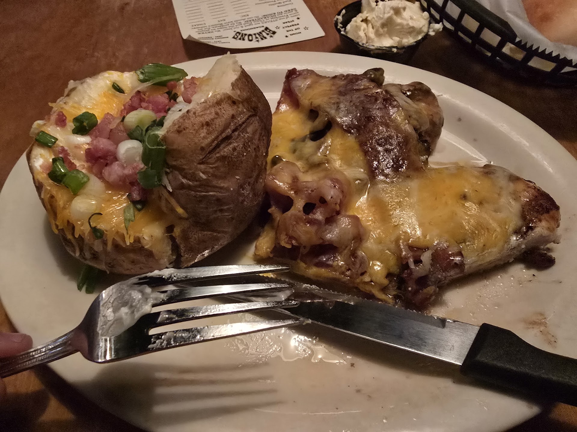 11/2/24 was the first time that I visited Binion's Roadhouse. We started off with a 2 hour wait to get seated. It was busy so we understood and it was honestly fine. We went to the bar and got drinks and was hanging out under the covered waiting area outside so we didn't mind. We got seated, ordered our drinks and food. Food came out and it was fantastic. Best steak I had in a long time. After a while the waitress asked how we wanted the checks split and she came back with our checks and we all handed her our cards.