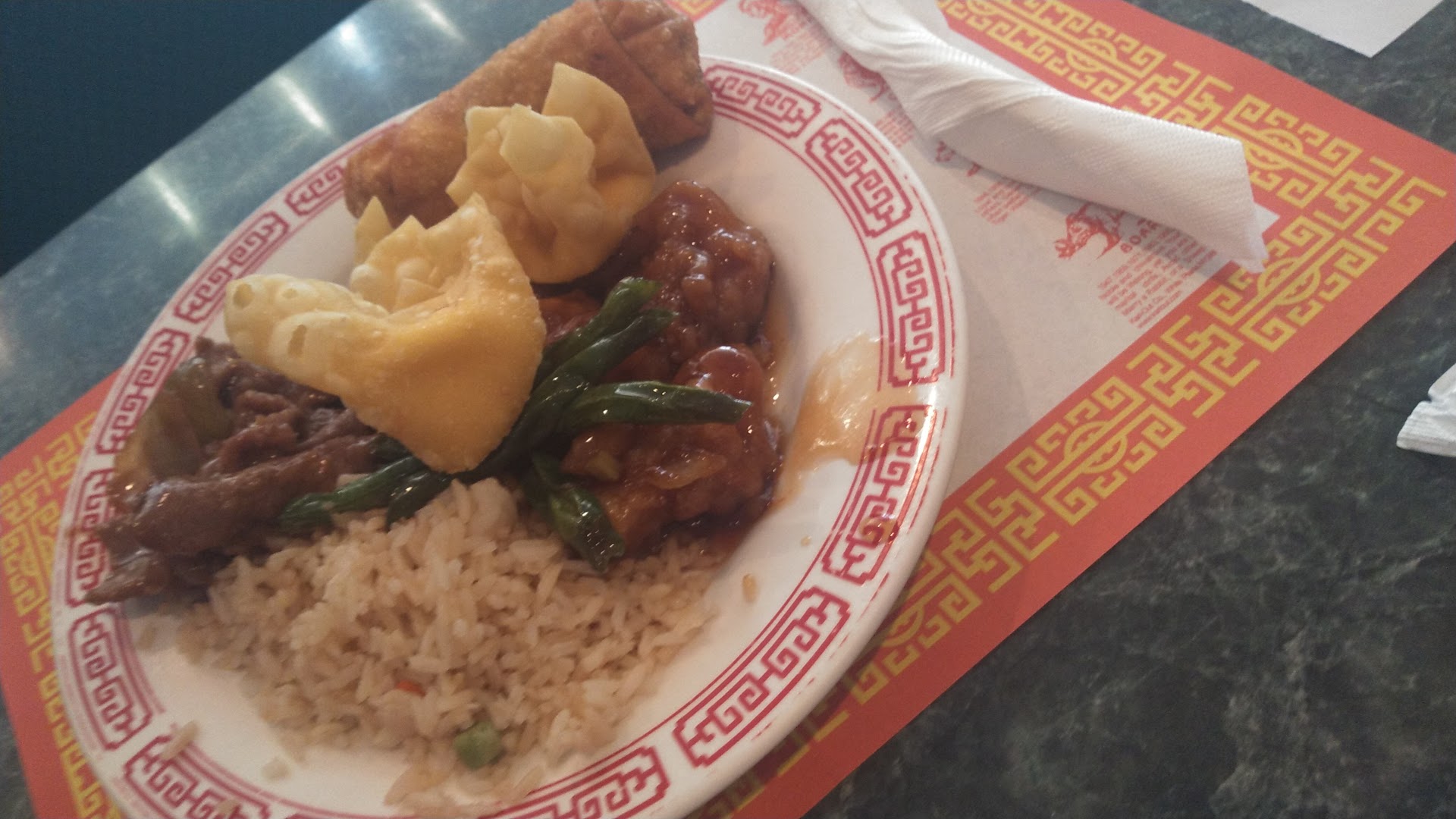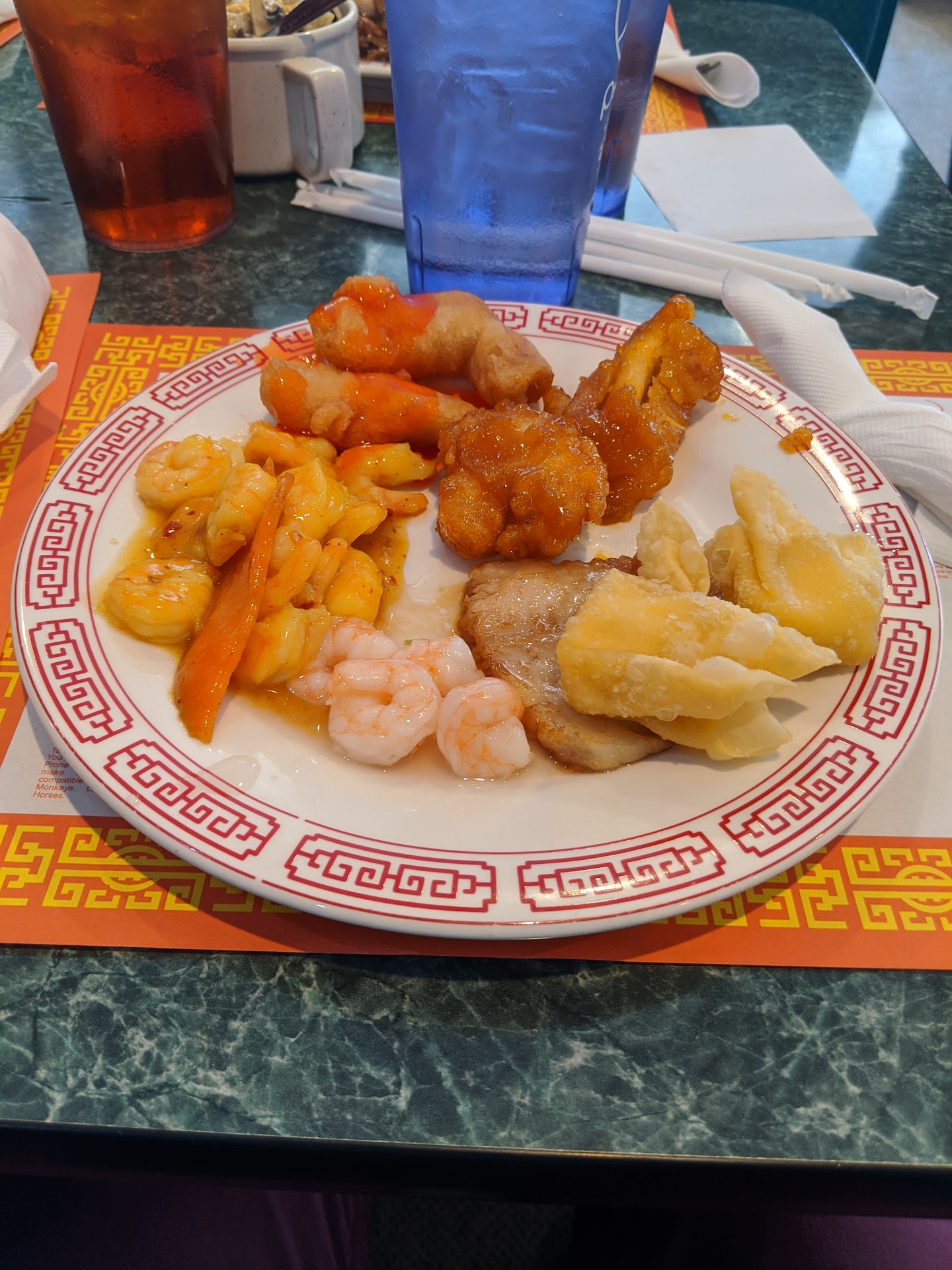 We come here frequently because my hubby's PT is right next door. The staff is really friendly and their service is outstanding, they are very kind with wonderful manners, they stay on top of your needs. And there's only 2 of them. I think it's unique the 2 waiters are Latinos and speak Spanish, yet the gentleman at the counter is Asia. I'm not sure what part of Asia he is from. But he is also very kind and nice!! The only negative I would have is the food that is served buffet style. We came at the right time. The food was hot, plentiful, and delicious. However, there is 1 food item I would love to see back, coconut cream shrimp. THAT WAS DELICIOUS and my favorite. I would like to see some little changes through weekly. For example, have a variety of different things and then change them around on a weekly or even daily basis. And a better selection of desserts with the same concept of changing them around. I am done, lol. We love this place and will continue to come here, prices are decent as well!!!! And the bathrooms have a clean appearance. Before we leave the waiter always brings us refills in to-go cups. Very nice! Thanks...