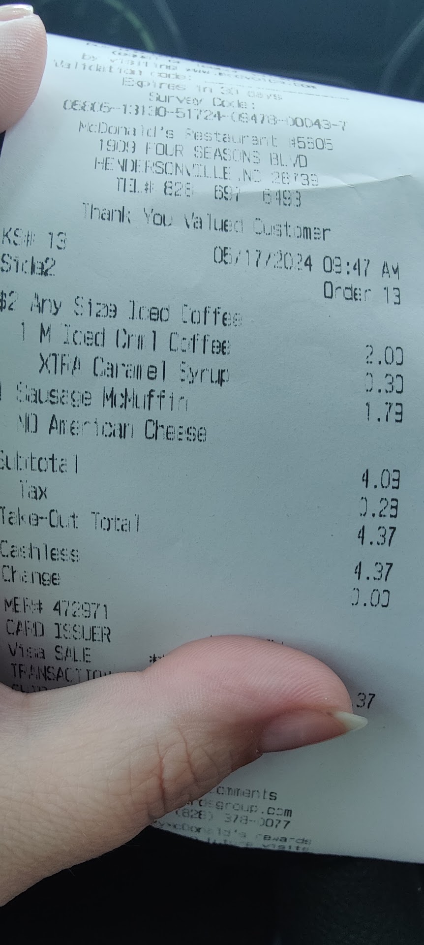 Read moreI had a very disappointing experience at the McDonald's drive-thru recently. I ordered an iced coffee with my breakfast at the speaker. Normally, I add caramel drizzle for $0.30 because iced coffee only comes with the caramel syrup. At the pay window I asked to add the caramel drizzle, but they rang it up with syrup instead. I noticed the mistake on the receipt as I was pulling up to the pick up window and brought it to the attention of the always lovely attendant, who was not sure how to address the issue and promptly turned to a gentleman manager behind her. The manager, Justin Reid, took my drink in his hand and studied it for all of 2 seconds and insisted that the caramel drizzle was already in the coffee based on an arbitrary demarcation line that could have easily been from adding the other ingredients to the cup.