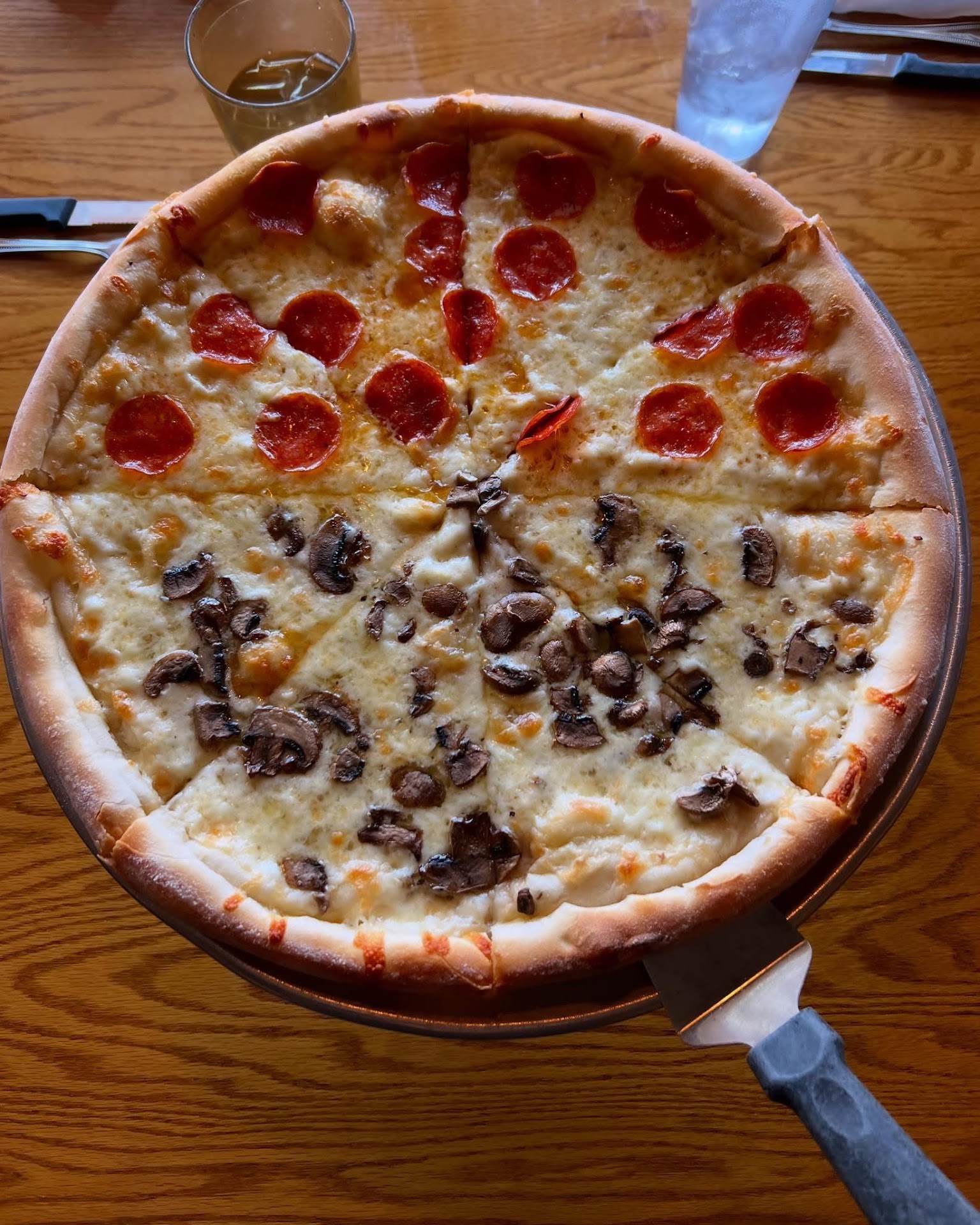 Now onto our amazing pizza! We ordered a 16ā pizza so we can have leftovers. We asked if they could do an olive oil, garlic base instead of sauce. āAbsolutely!ā So our pizza with an olive oil- garlic base, half pepperoni and half mushroom was ordered!