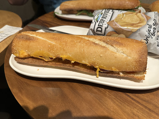 1st wanted bread bowls for soup, could not because they were out, wanted the baguette for sides, could not they were out so order chips as sides for all three but apparently out because we got apples? Employees were openly discussing what to put in bags without asking the customers as I was standing there waiting for my order. My sandwich was supposed to be no Onions, screen said my order was ready but the employee behind the counter noticed it was supposed to be no onions so they said they would remake it ( not sure how because they were out of baguettes) employee that appeared to be in charge of the line told her to scrape it off and re use the bread. That was bad enough but guess what? Sandwich still had onions on!!!! Are you kidding me after all that no communication on giving apples instead of chips. Cold sandwiches. As well as one re made and still had onions on it.