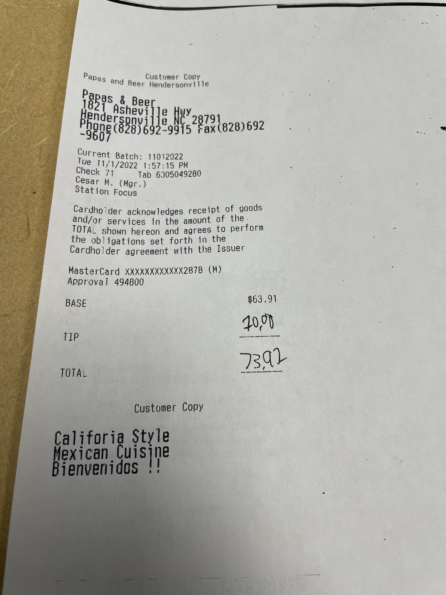 Read moreI was really disappointed tonight. We've came here for a very long time, we've spent ALOT of money here, we literally recommend everyone here for awesome Mexican food. And before I continue, tonight the food was cooked great....But it wasn't what I ordered. And I've ordered here lots of times. When ordering I specified exactly what was wanted, and even double and triple checked it and made sure it wasn't something else. When I received it, it was the thing I specifically asked for it NOT to be. Now normally I'm an easy person with this kind of thing because I've waited tables for years. So when I brought it to the servers attention and they pretty much told me "Oh well, not our problem you still have to pay for it because Im not paying for it"..And then when I asked if I could just send this back and get what I asked for, or something even simpler so it was easy on them I was told "sure you can but you have to pay for it all".. the wrong order and the new order..Its safe to assume I was pretty upset. Then I order something simple because my son needed to eat and when I got that it had something on it I asked for it not to have also.. I didnt even say anything we just paid and left. If it was my fault and I didnt know what I was ordering or if I was careless about it (which I've done before) I would be more than happy to "eat the cost". But this wasn't the case tonight, we've always brought lots of buisness to this restaurant and raved about it all the time. But this experience really turned me off of Papas & Beer and that upsets me because we really...